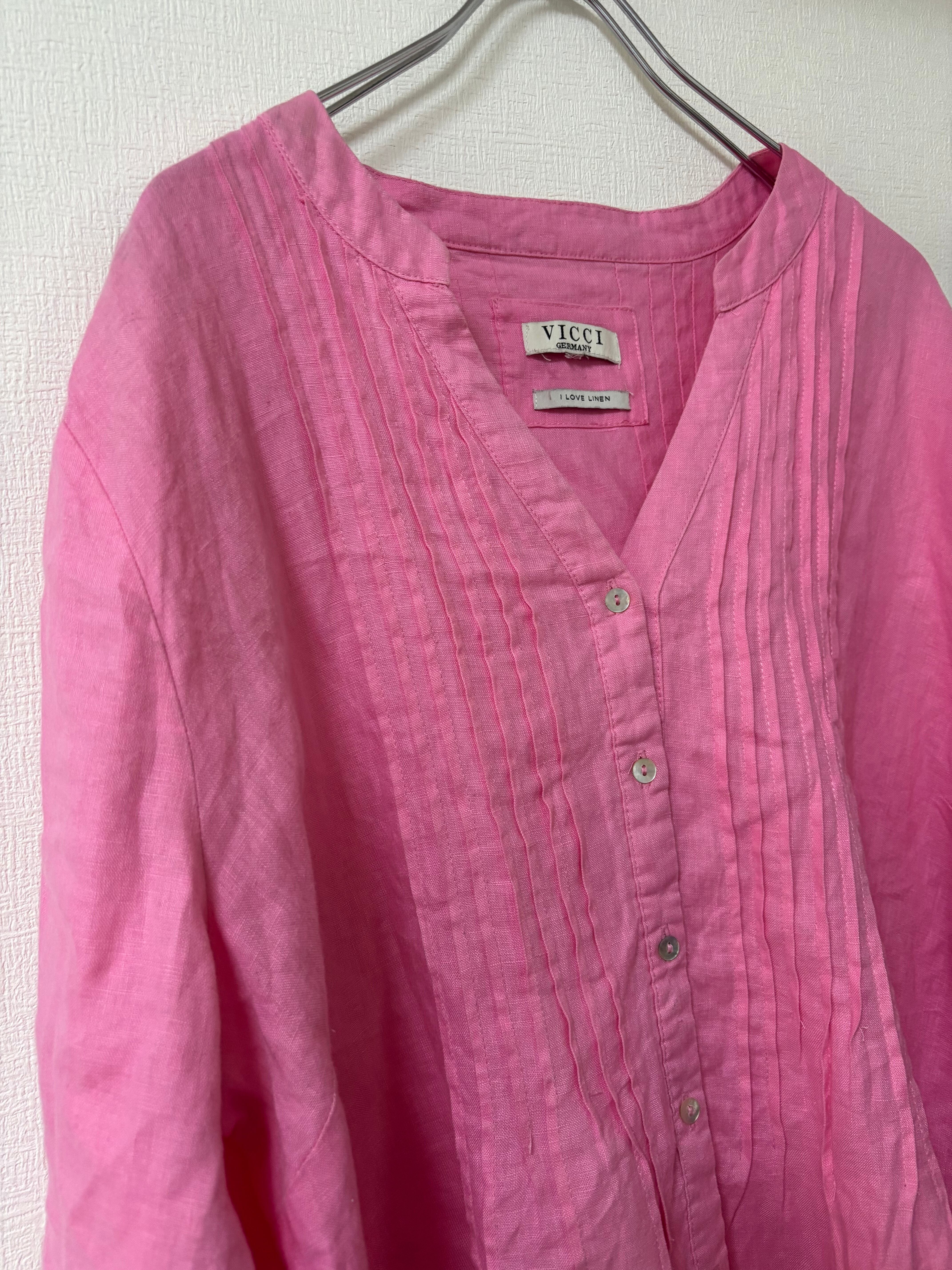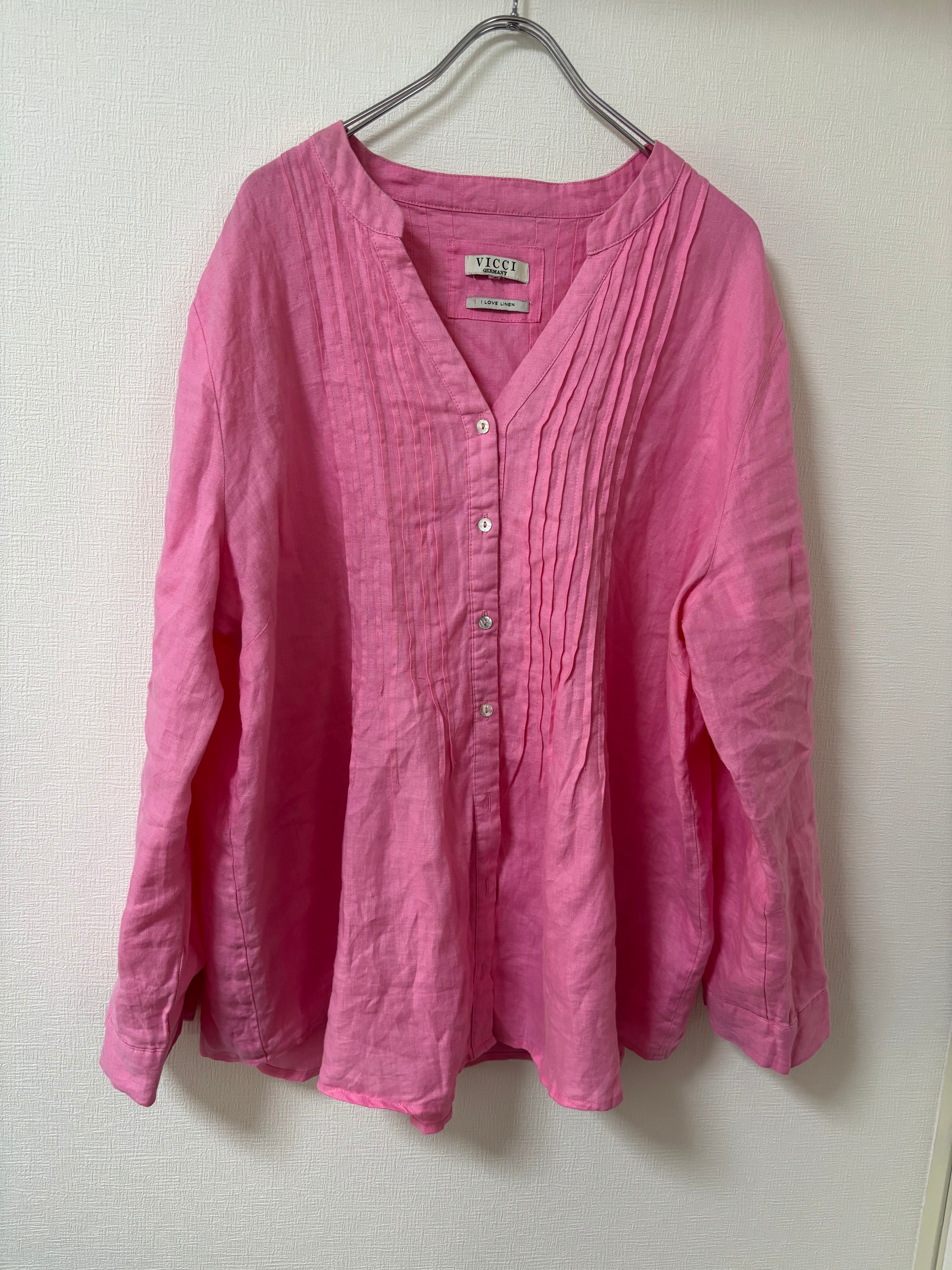 ピンクカラーにシェルボタンが可愛いリネンシャツです。