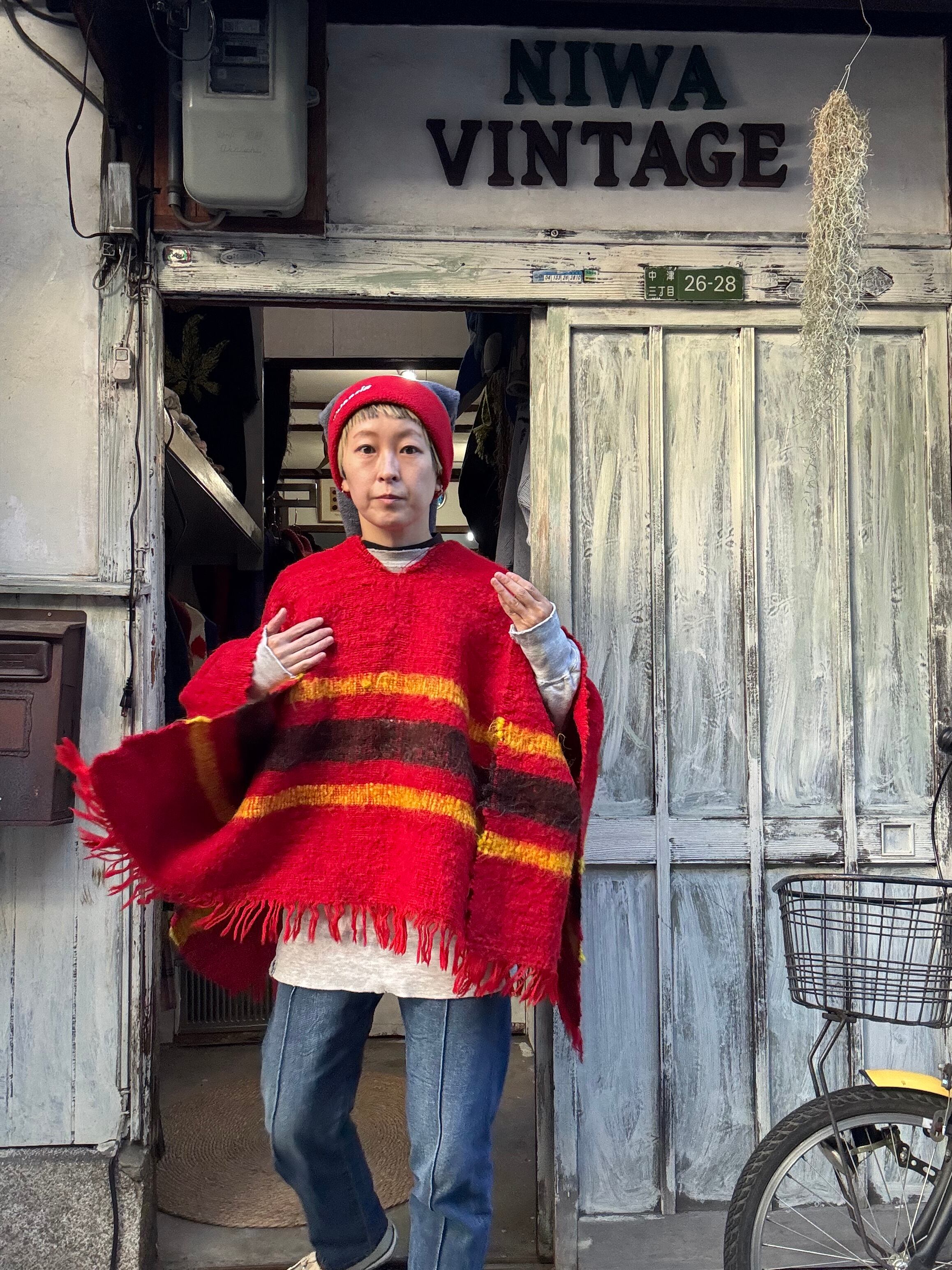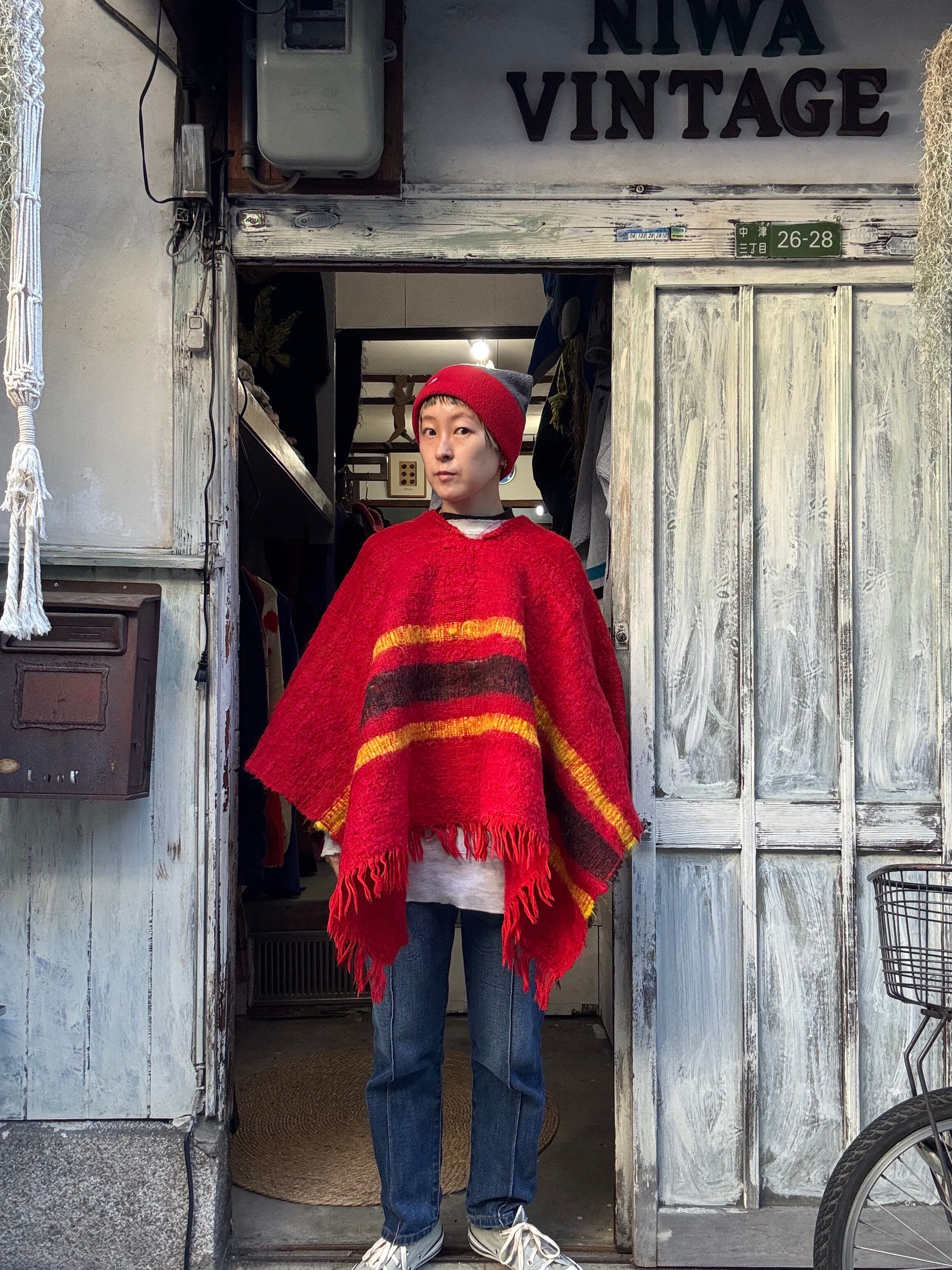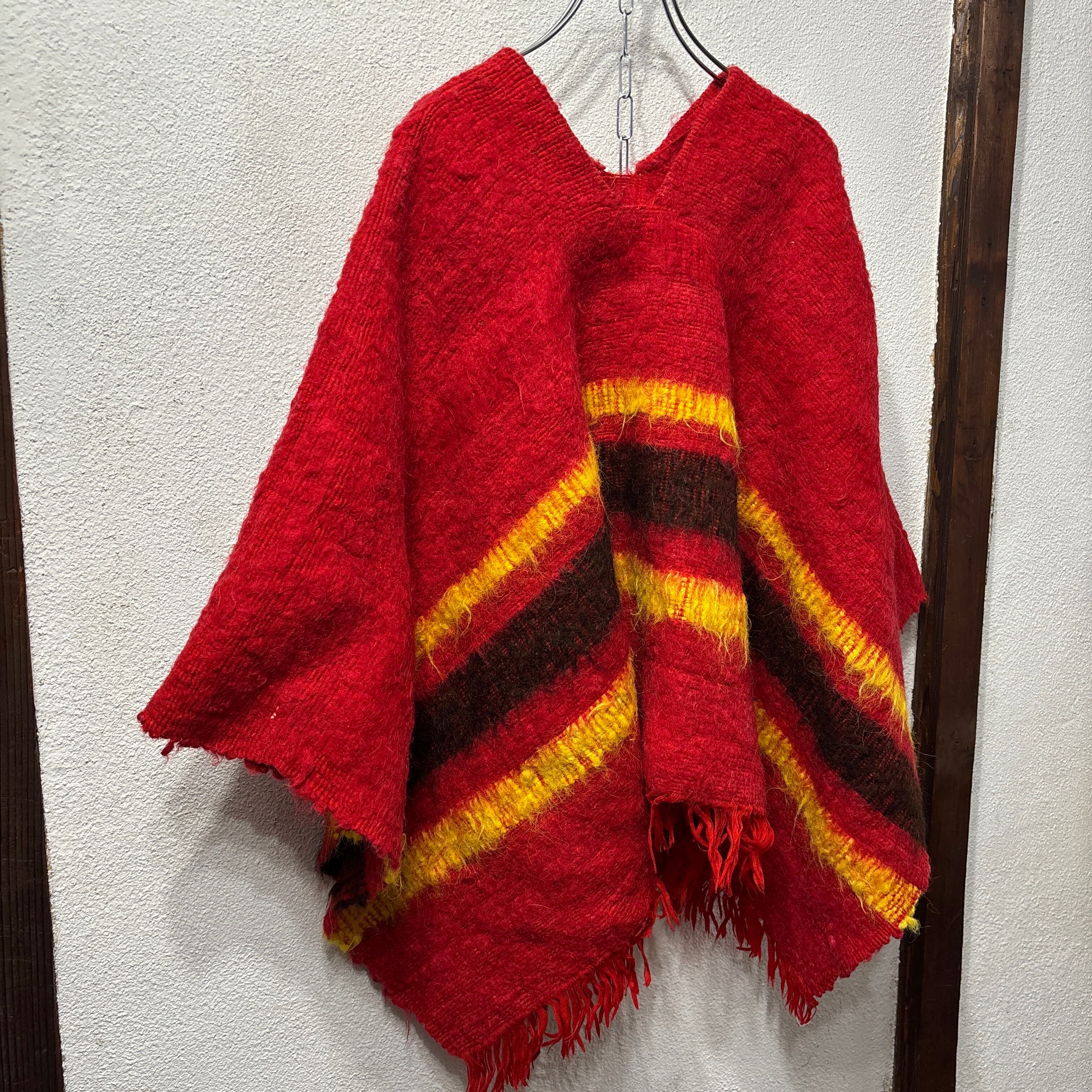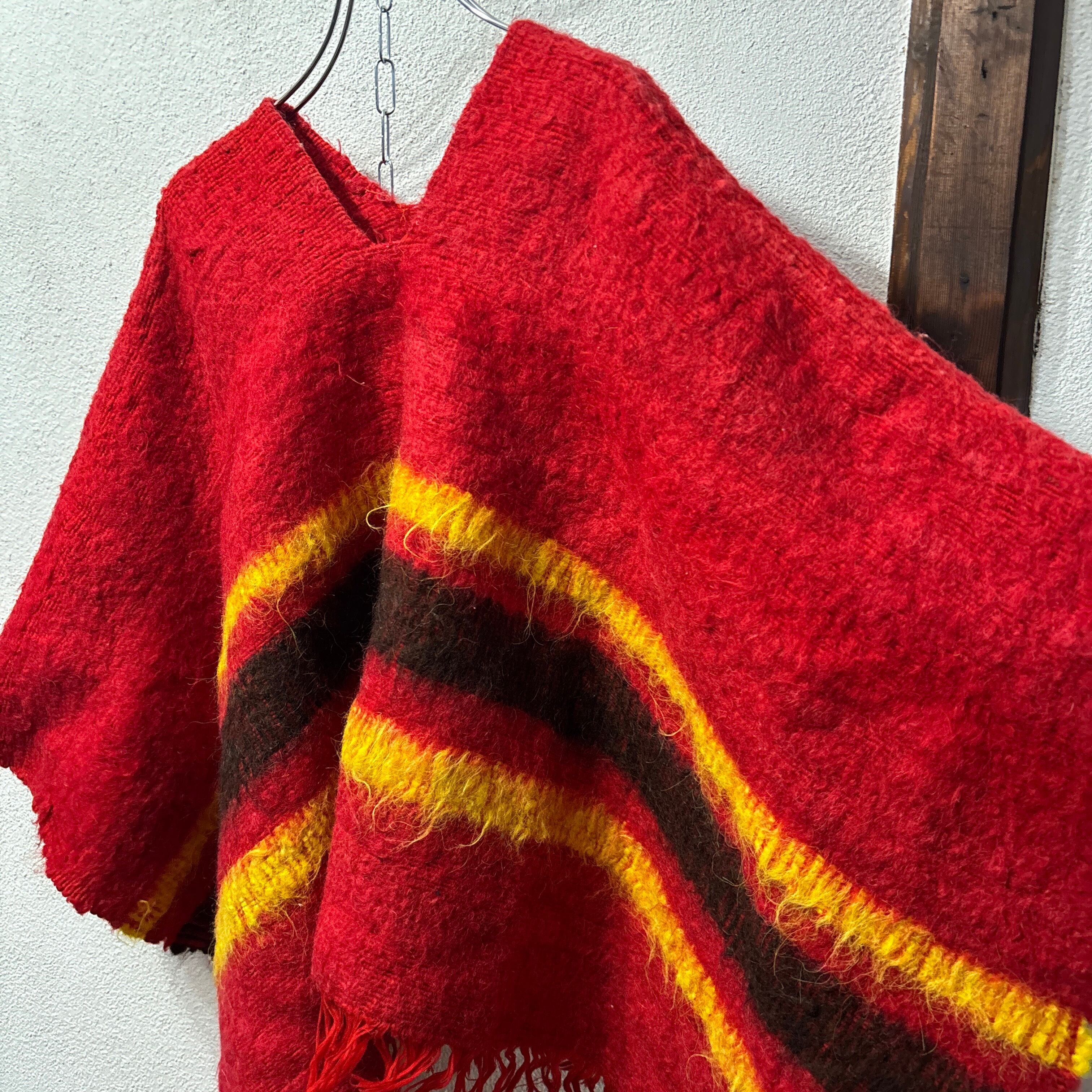 手織りで作られたと思われる赤ポンチョ。