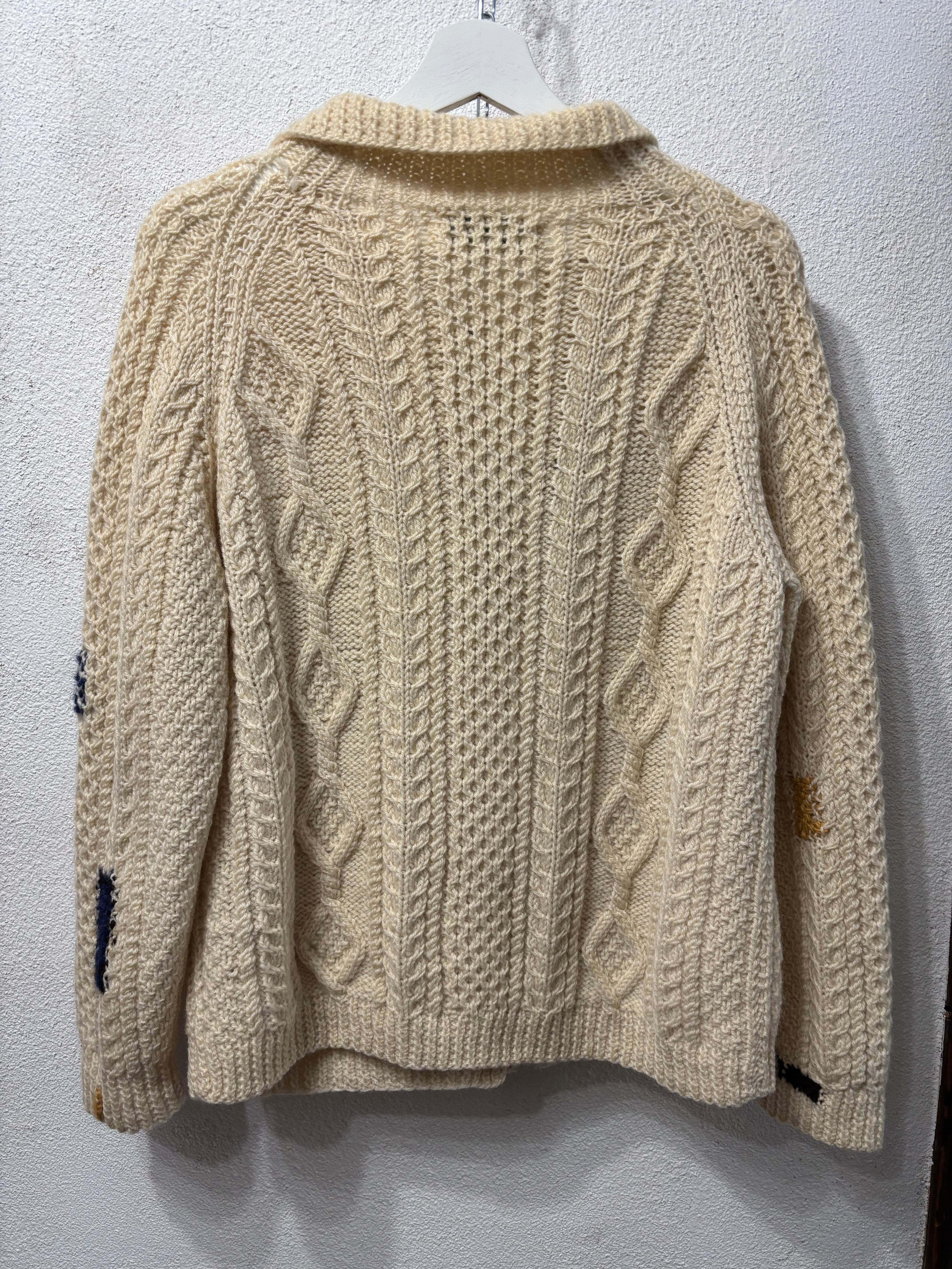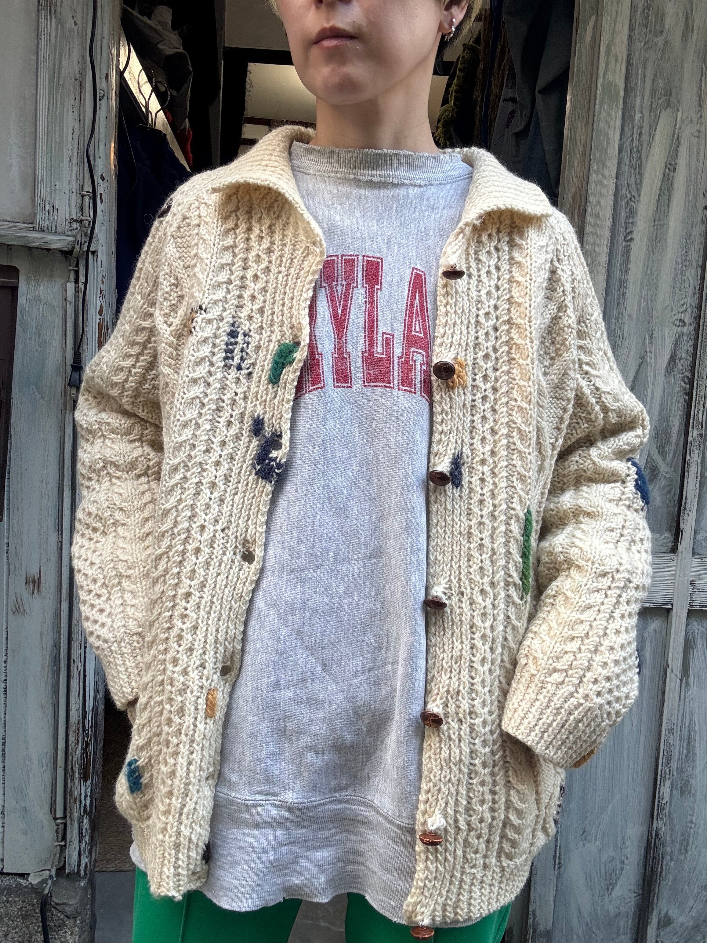 vintageのアイルランド製のフィッシャーマンカーディガンにオリジナルダーニングを施した物。