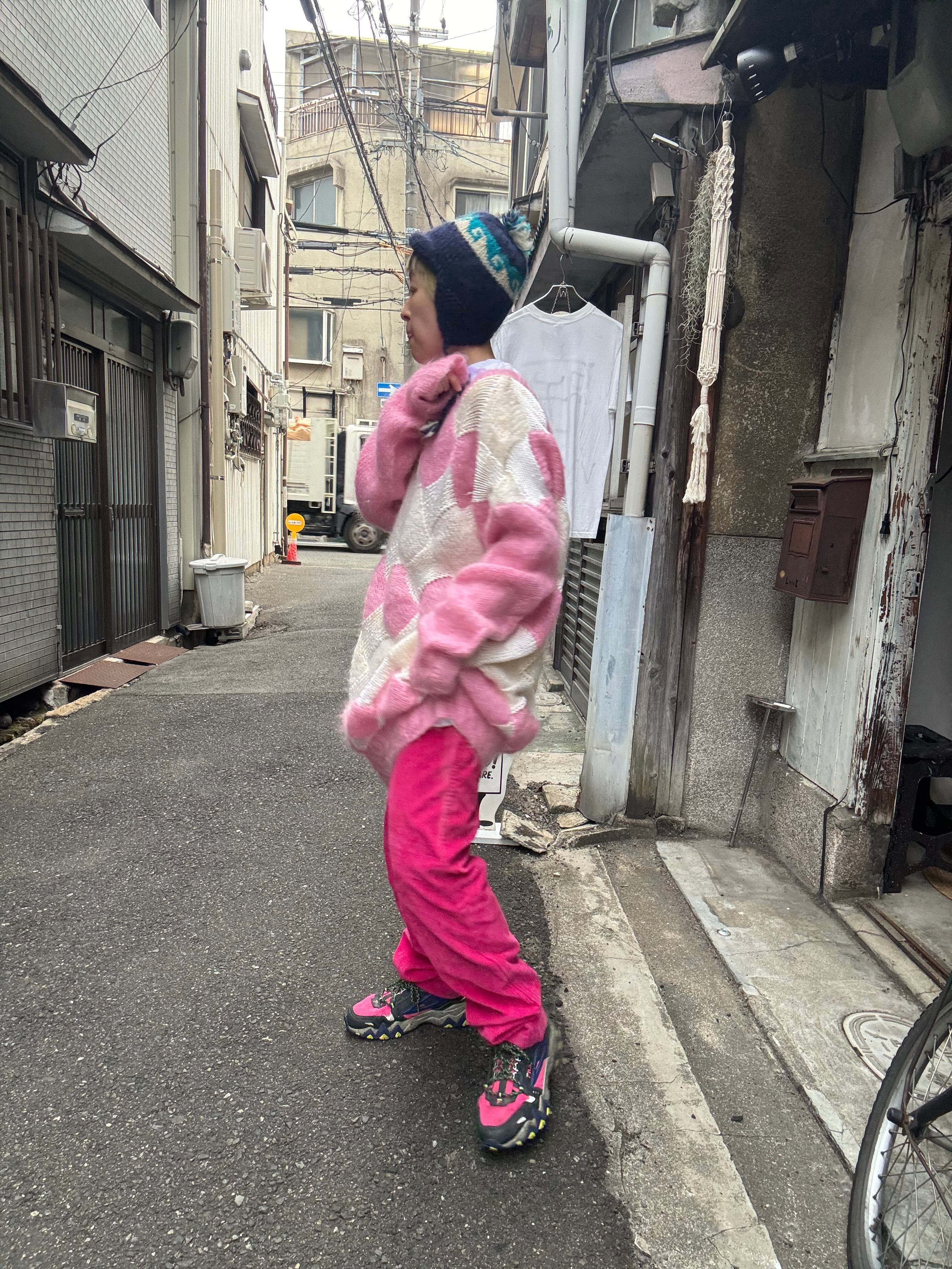 ビビットなpinkカラーなので差し色コーディネートで着用するのがおすすめです。