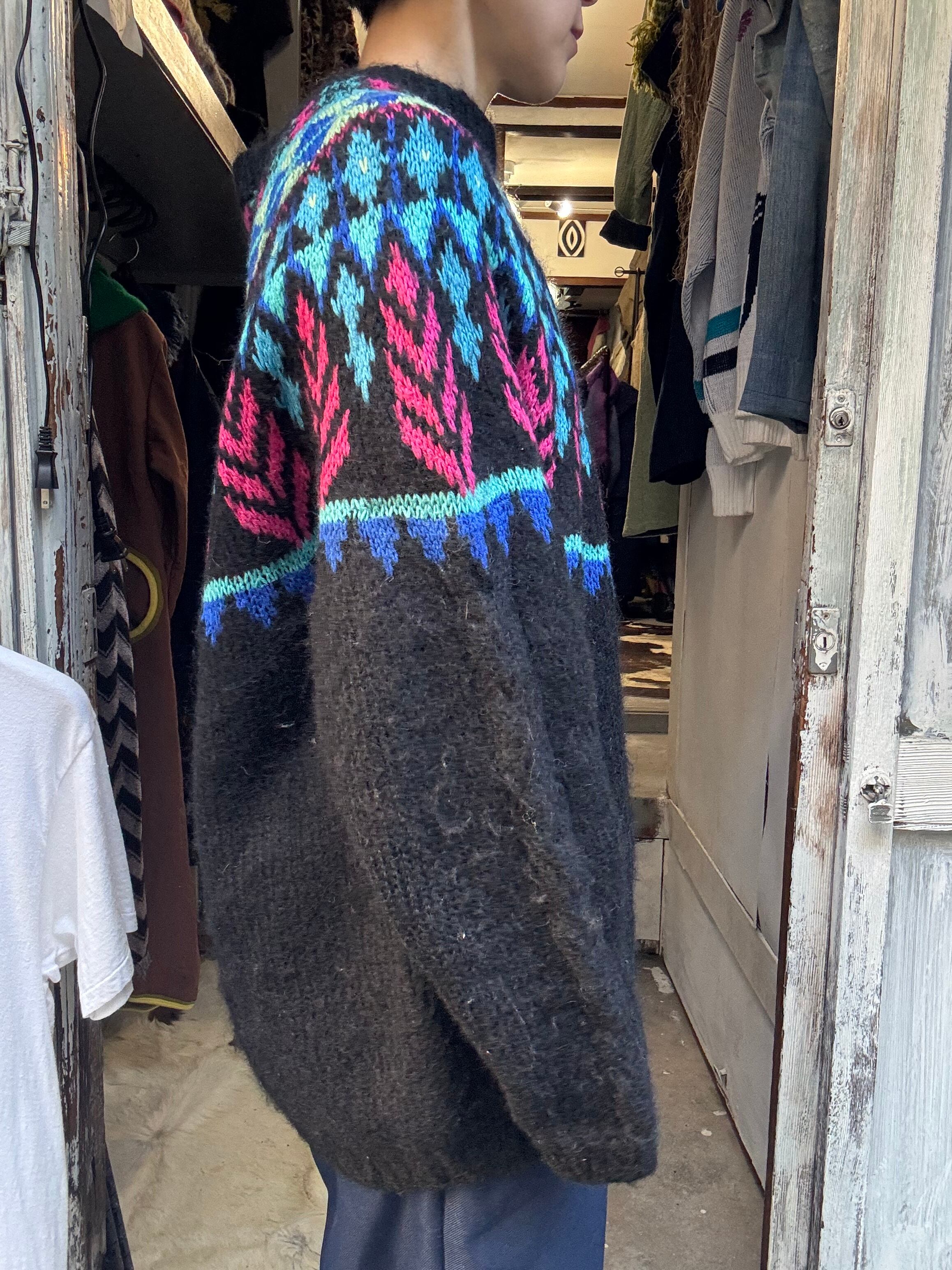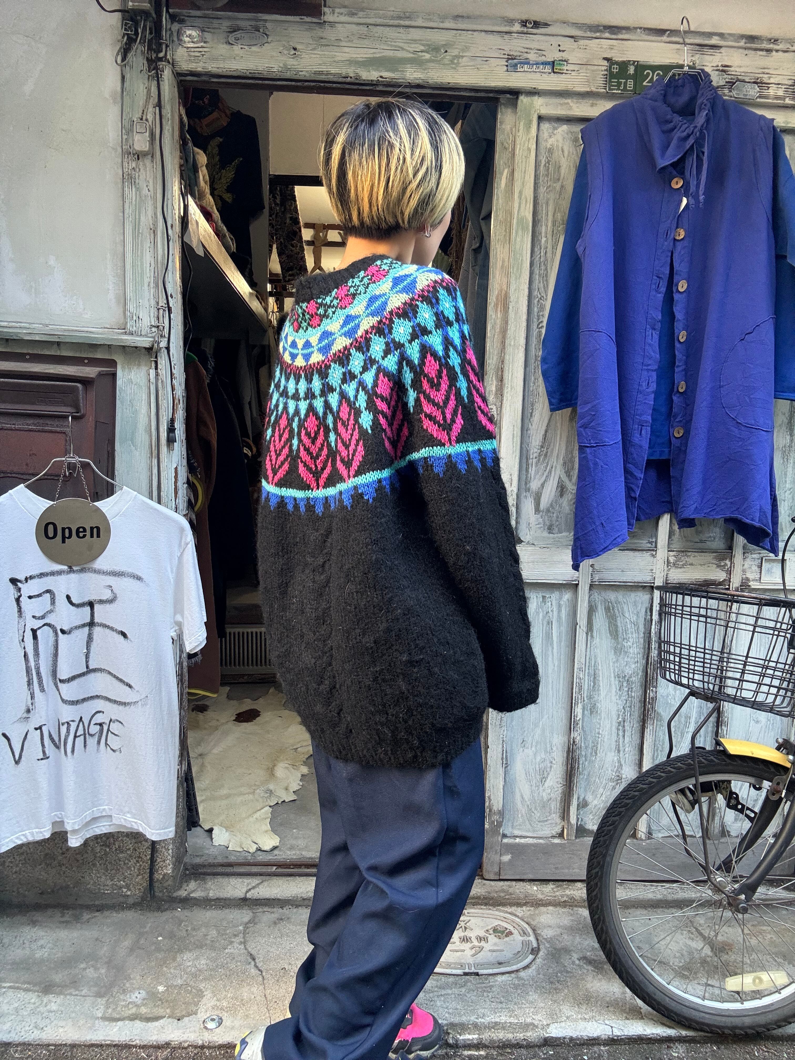 カラーリングが珍しいノルディック柄のセーターです。黒がベースなので合わせやすいかと思います。