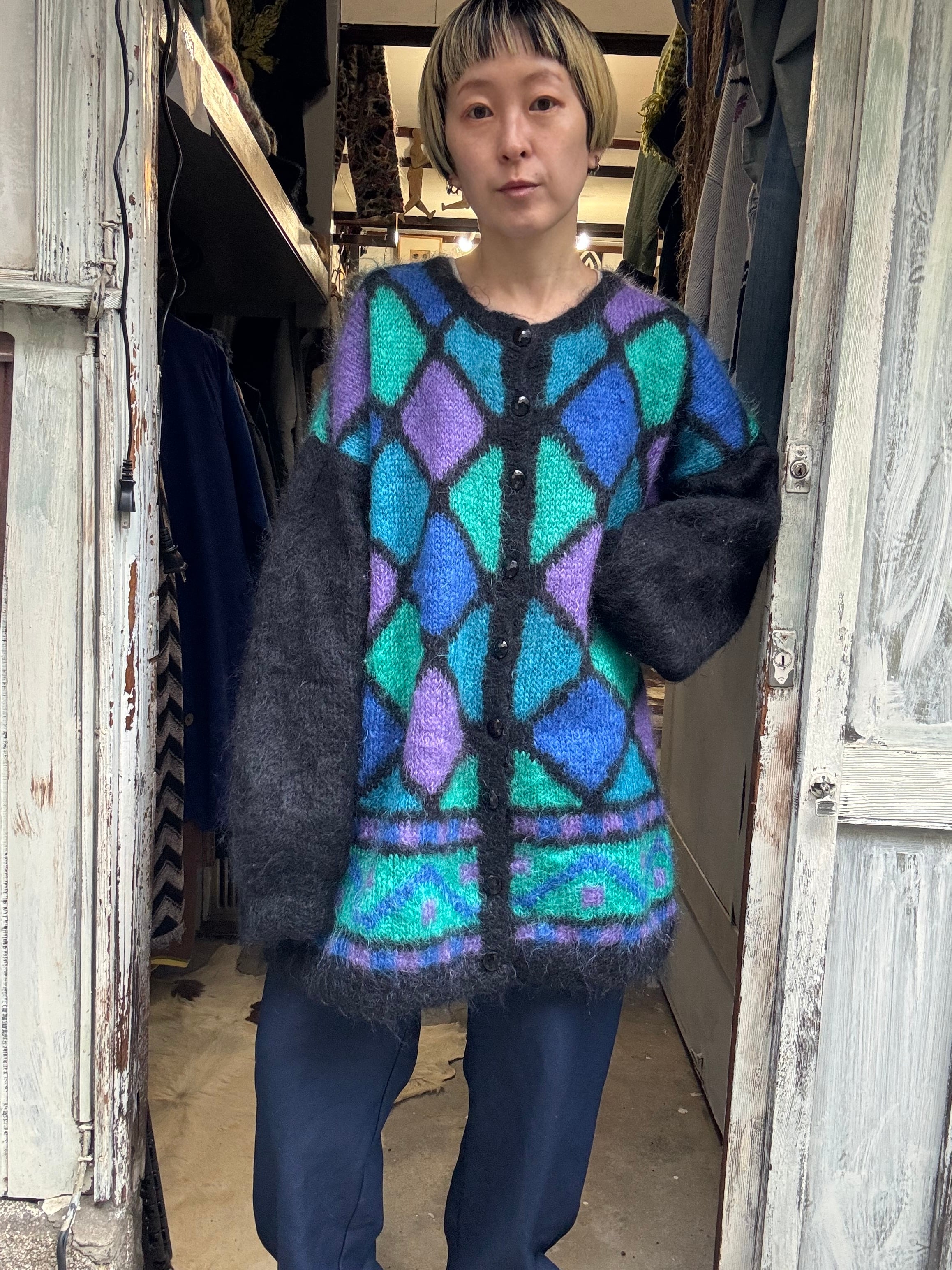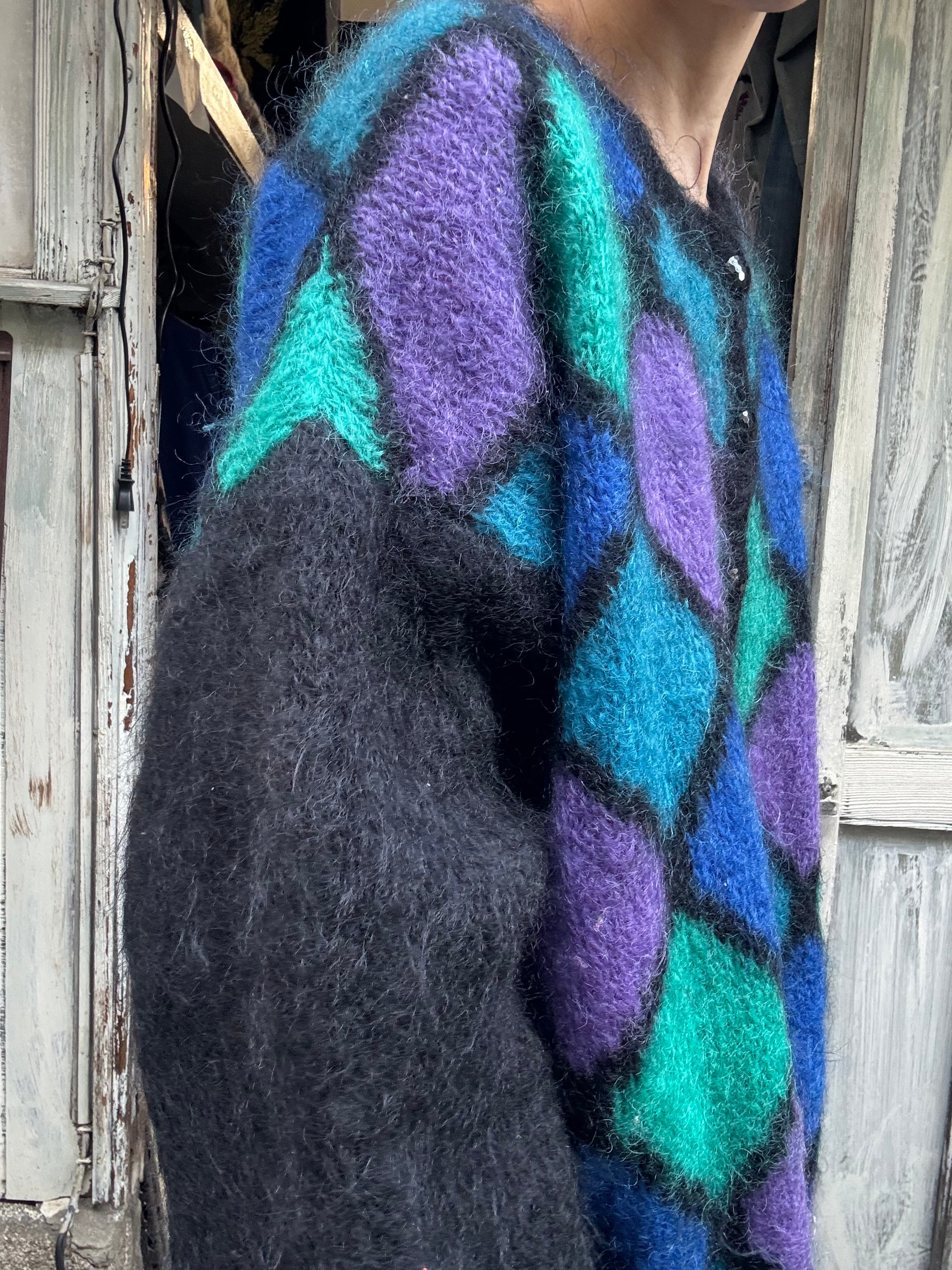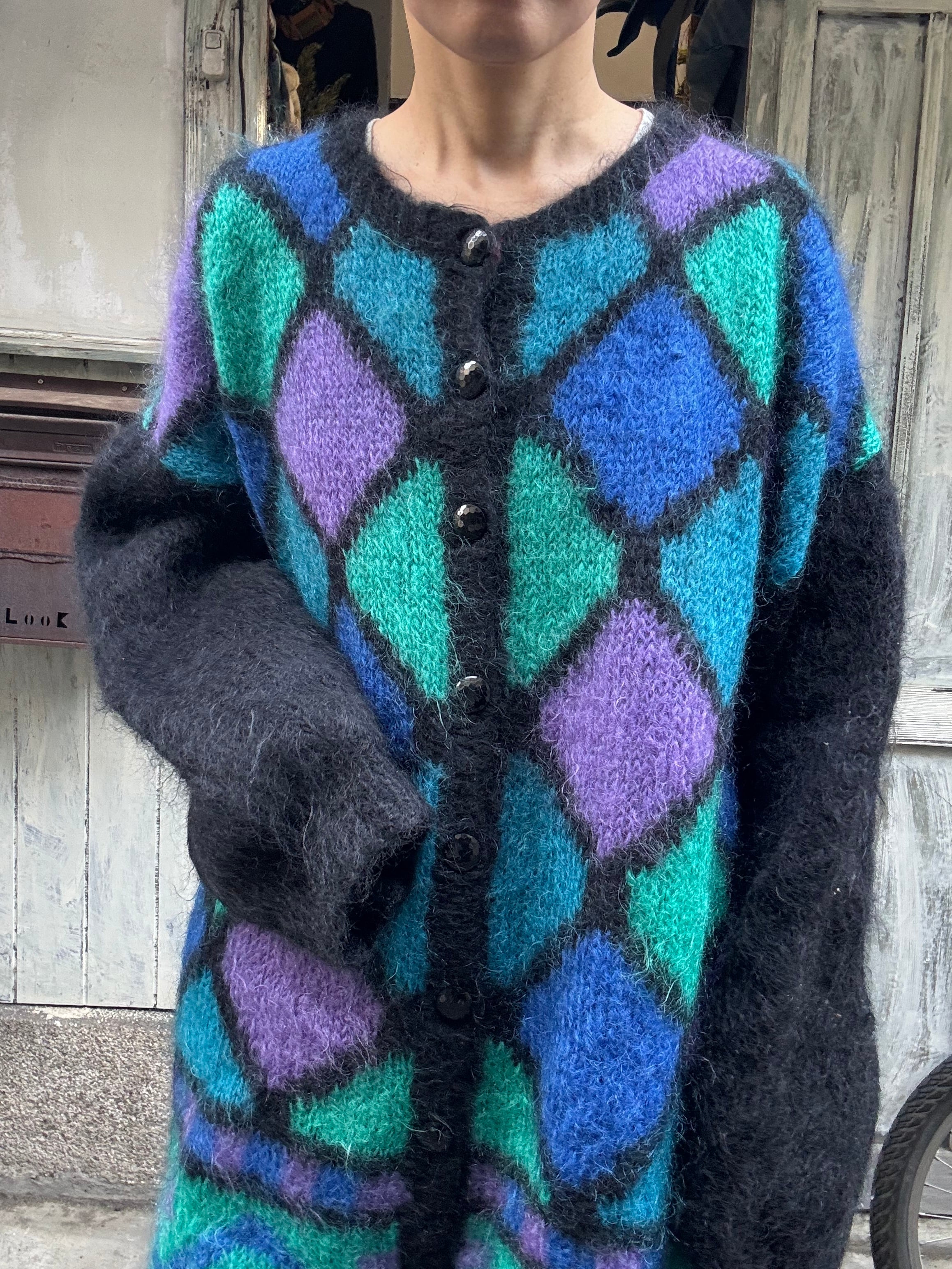 ひし形デザインのオーバーサイズモヘアカーディガン。