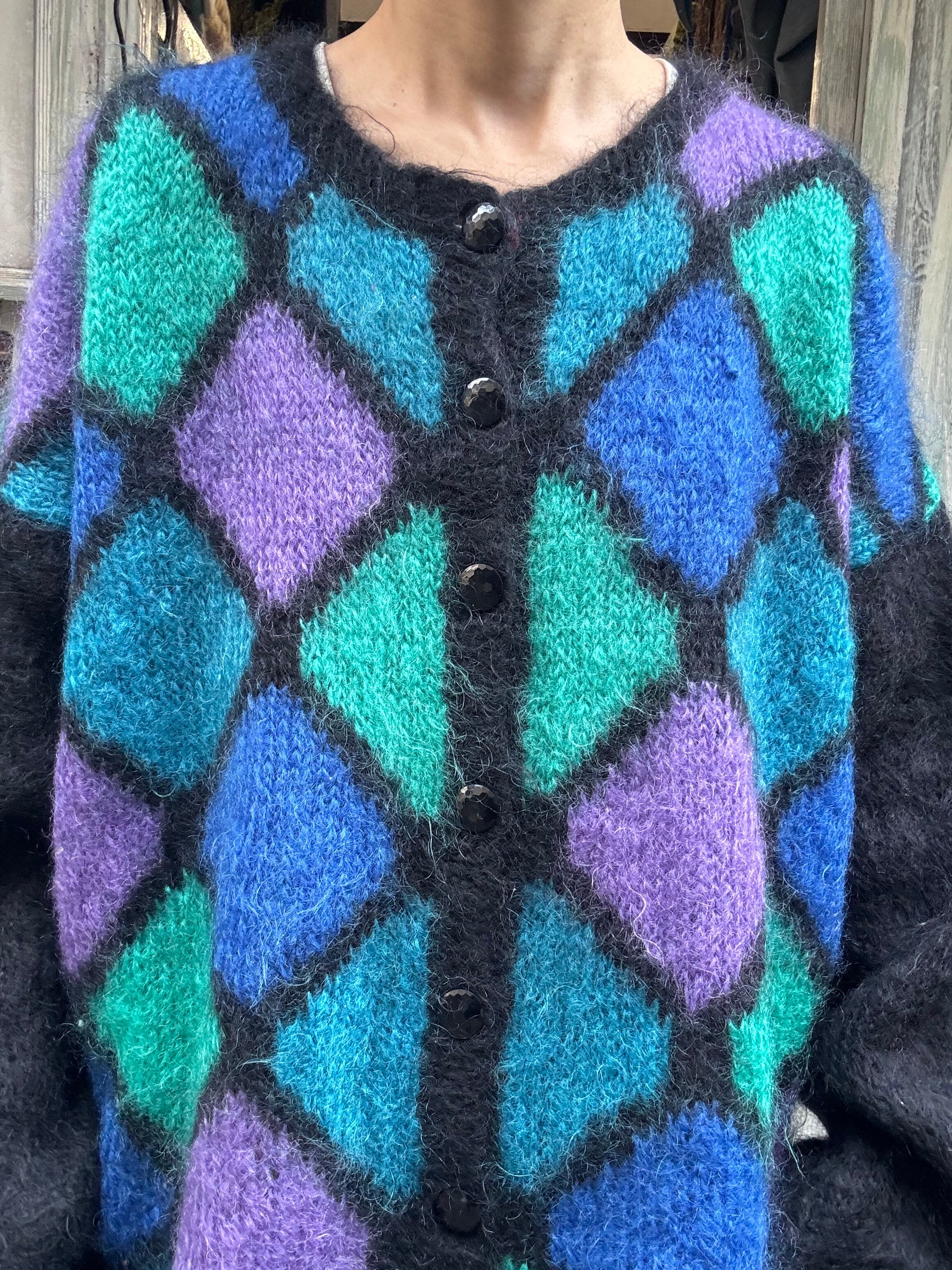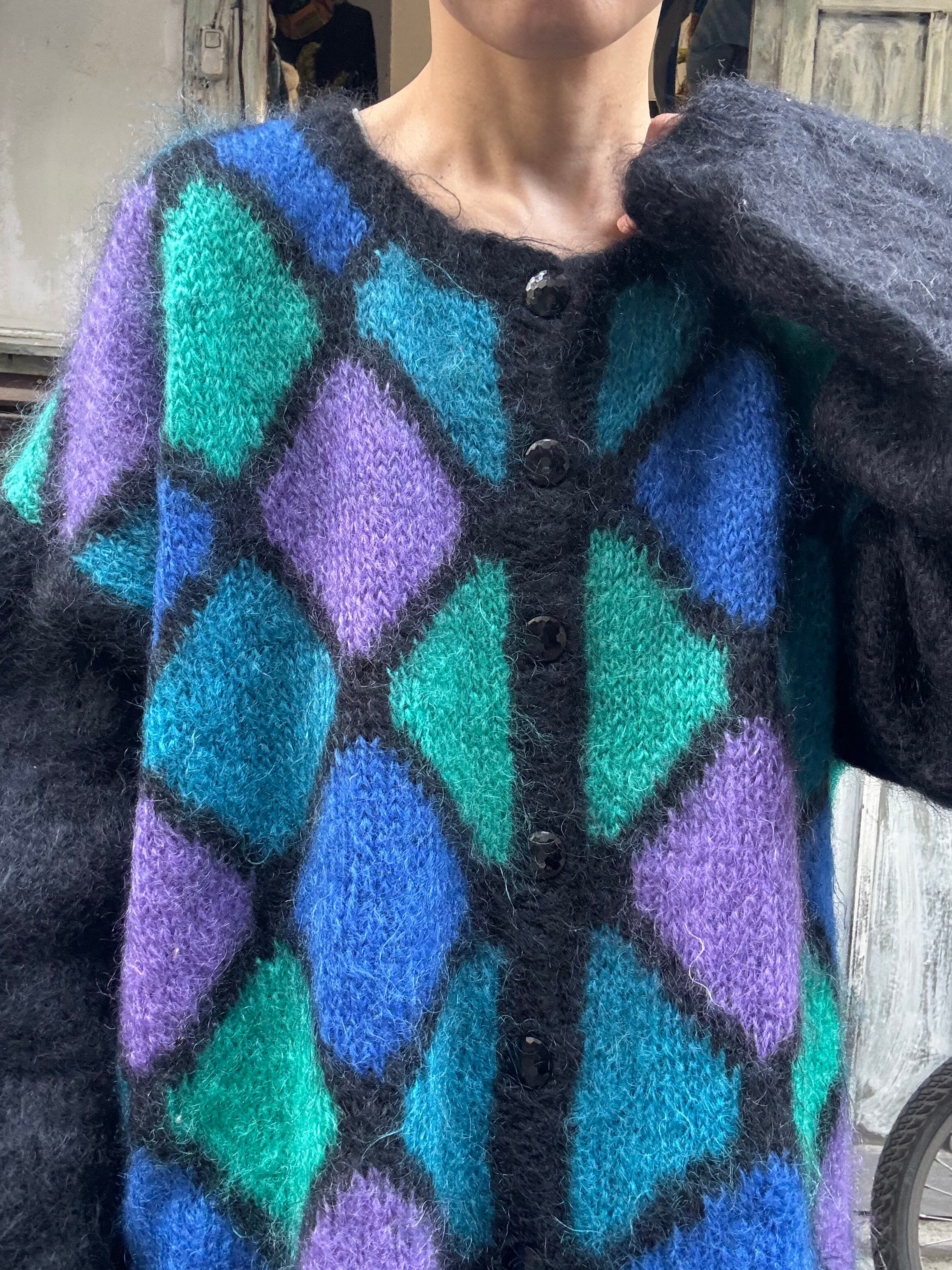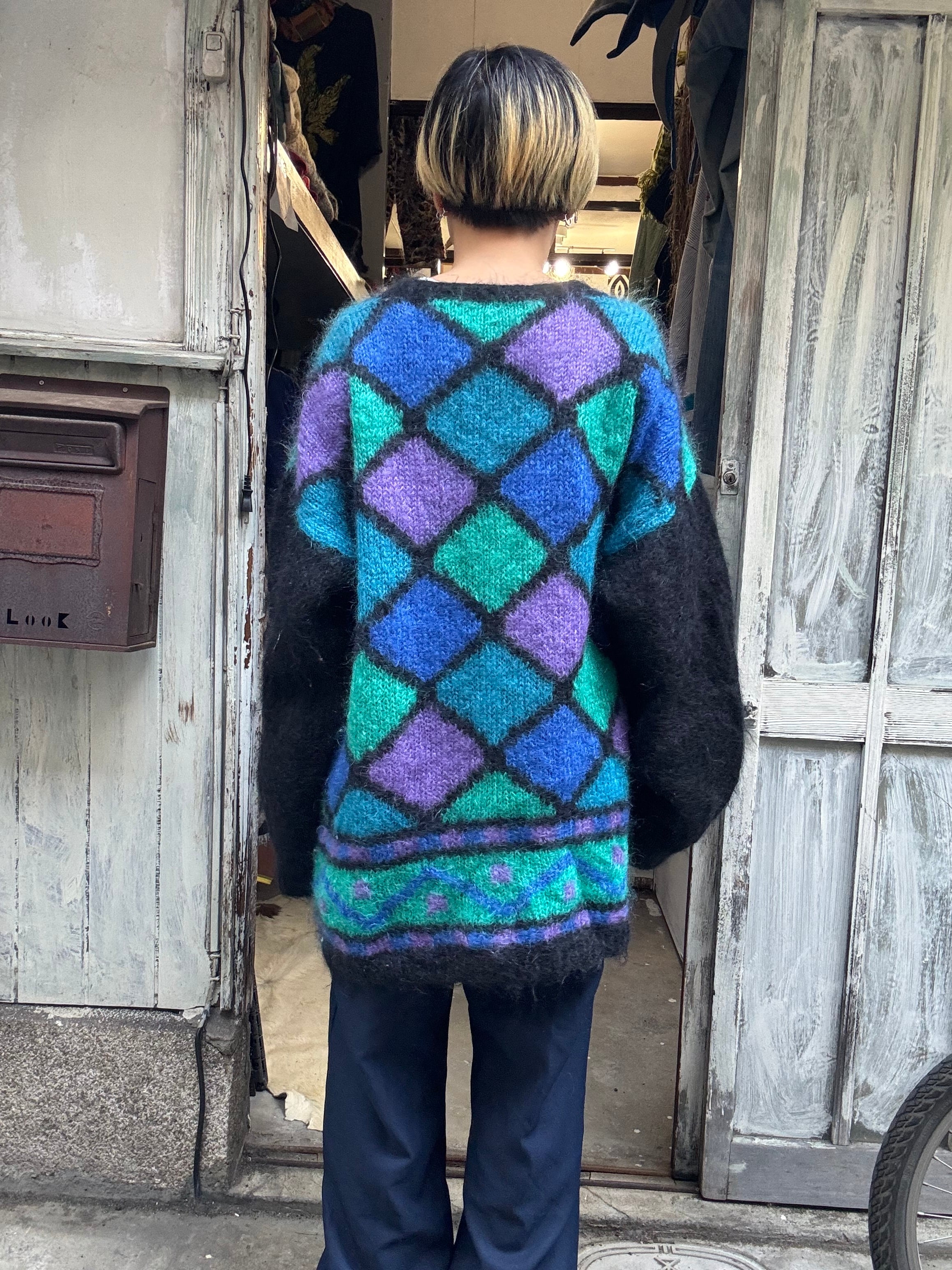 ひし形デザインのオーバーサイズモヘアカーディガン。