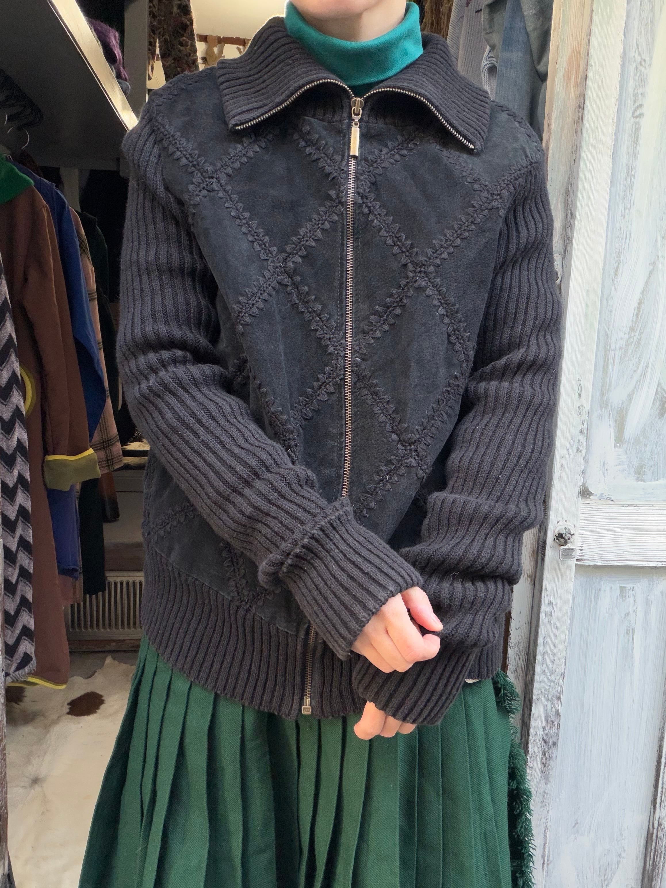 ホワイトスタッグのニット素材とレザー素材がドッキングしたセーターです。