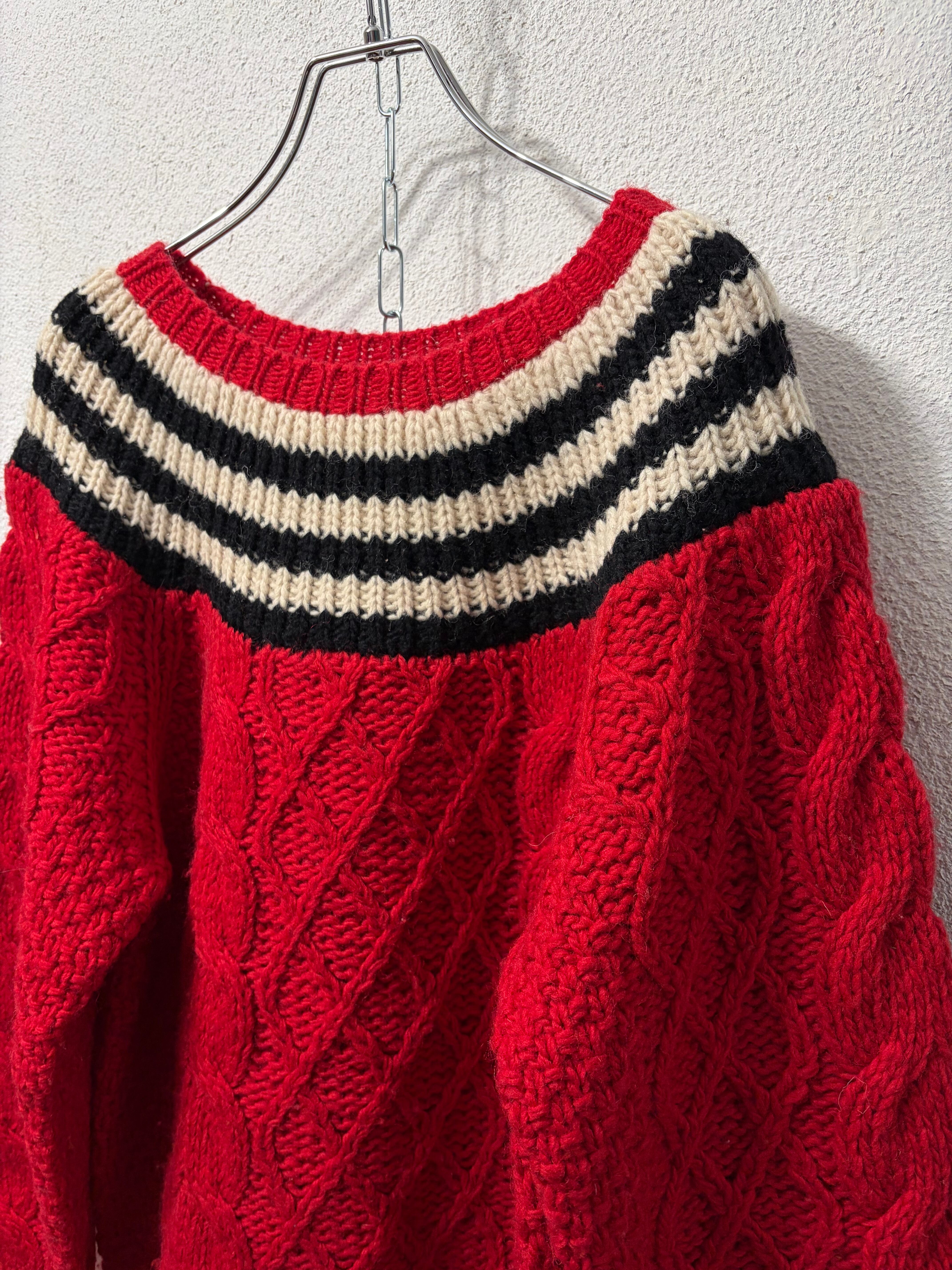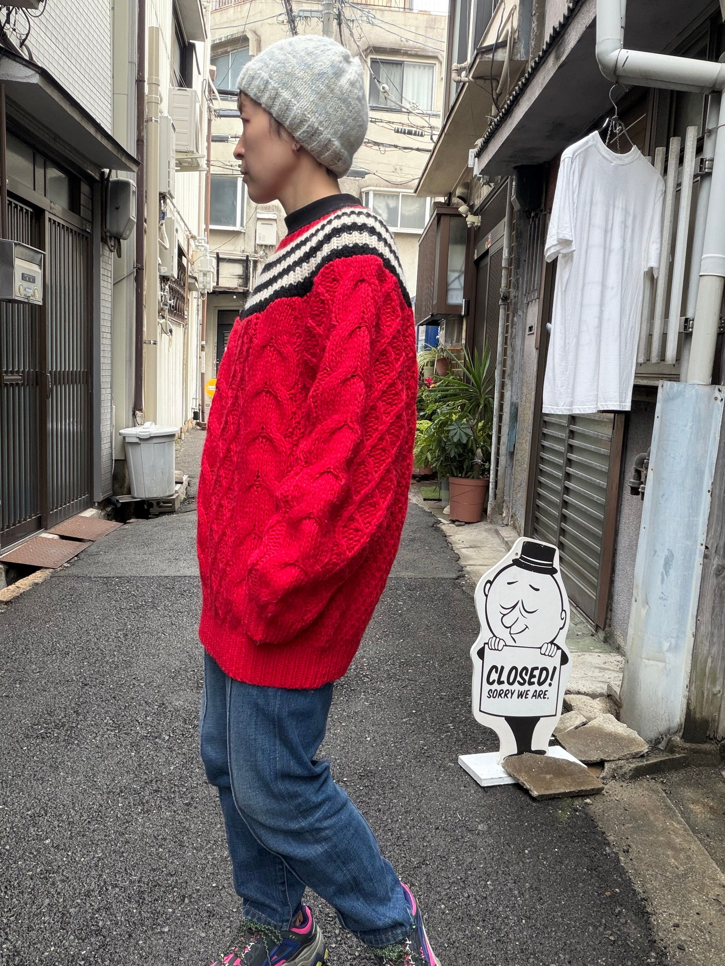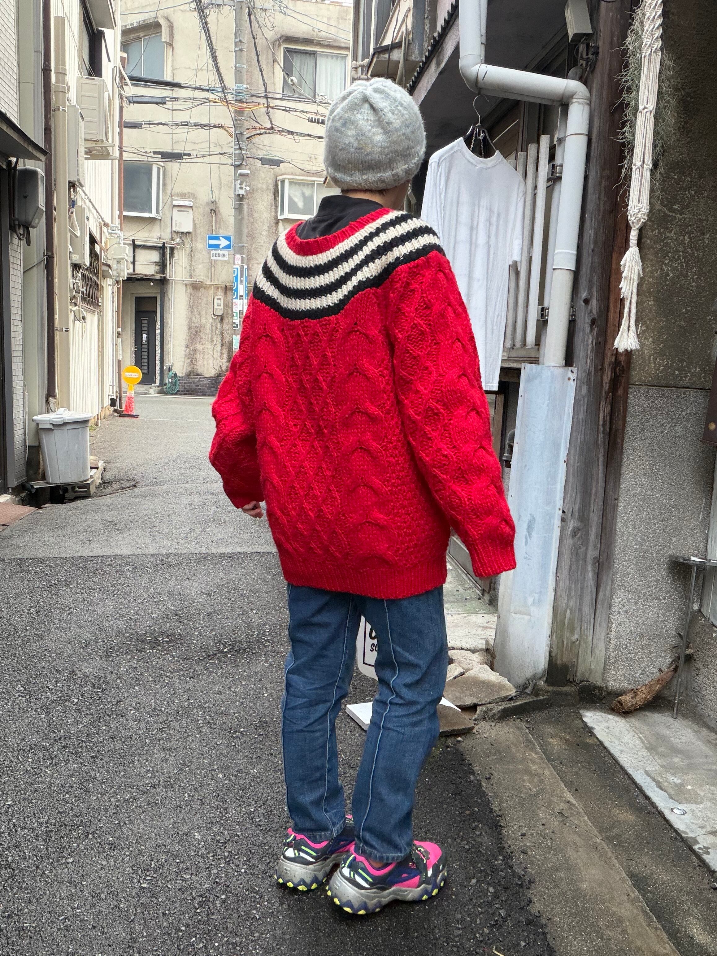 赤のケーブルセーターにボーダーのラインが入ったデザインセーター。