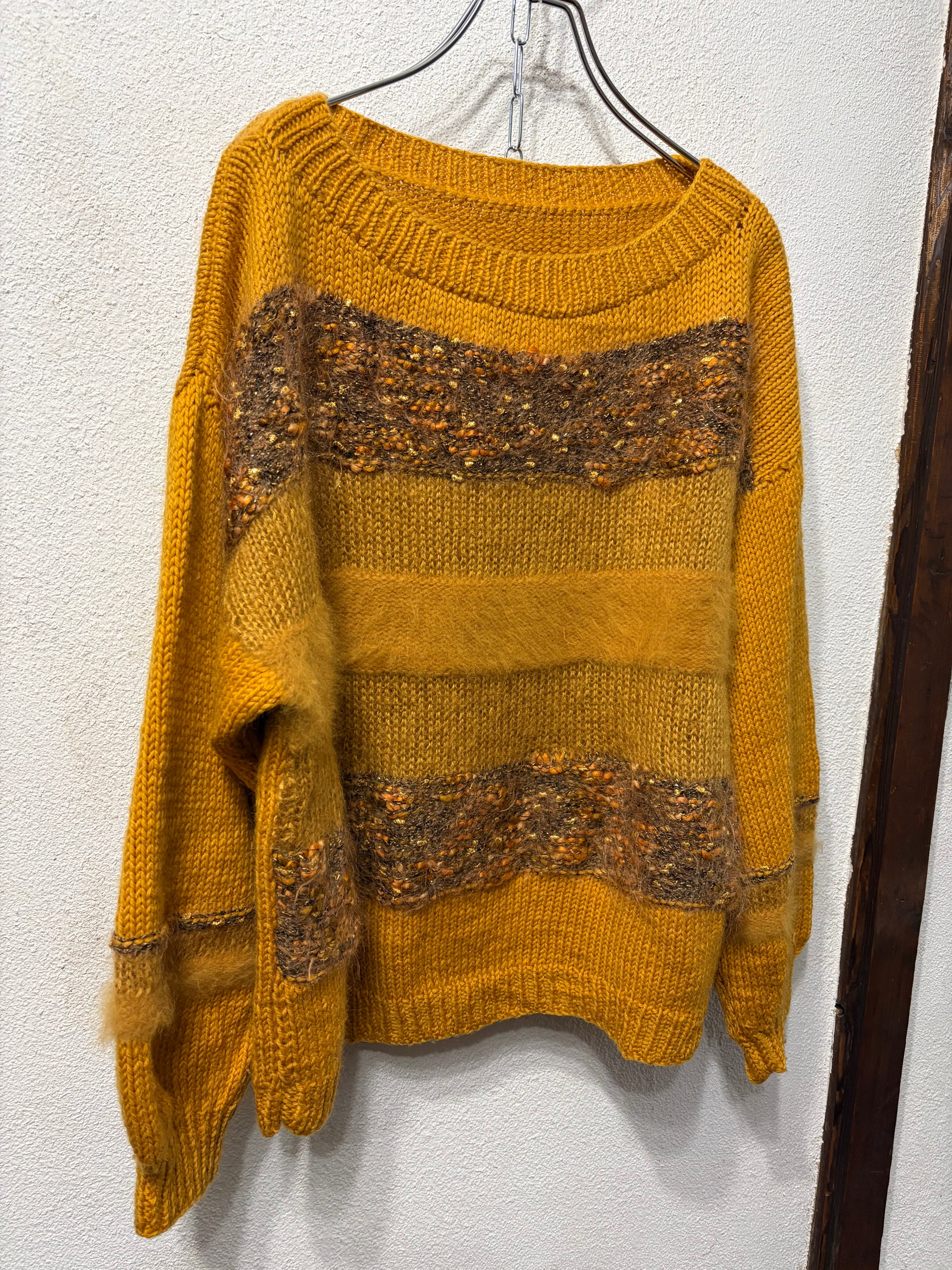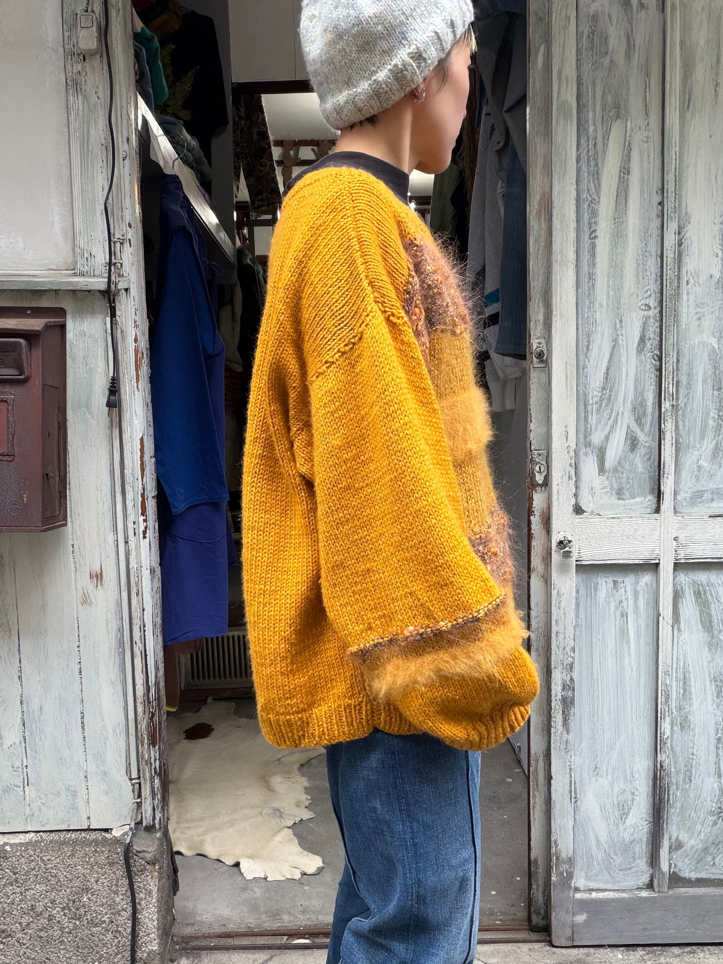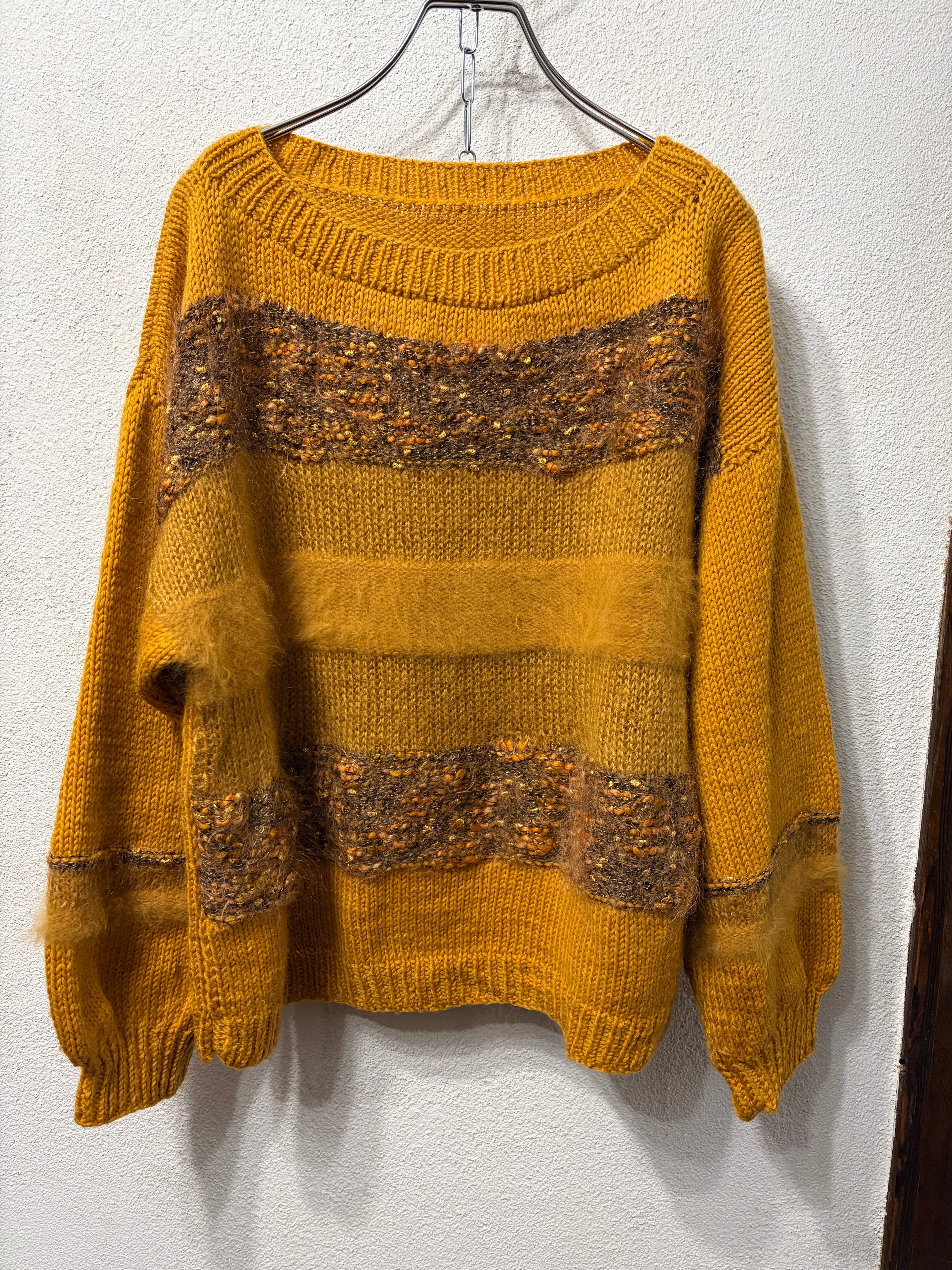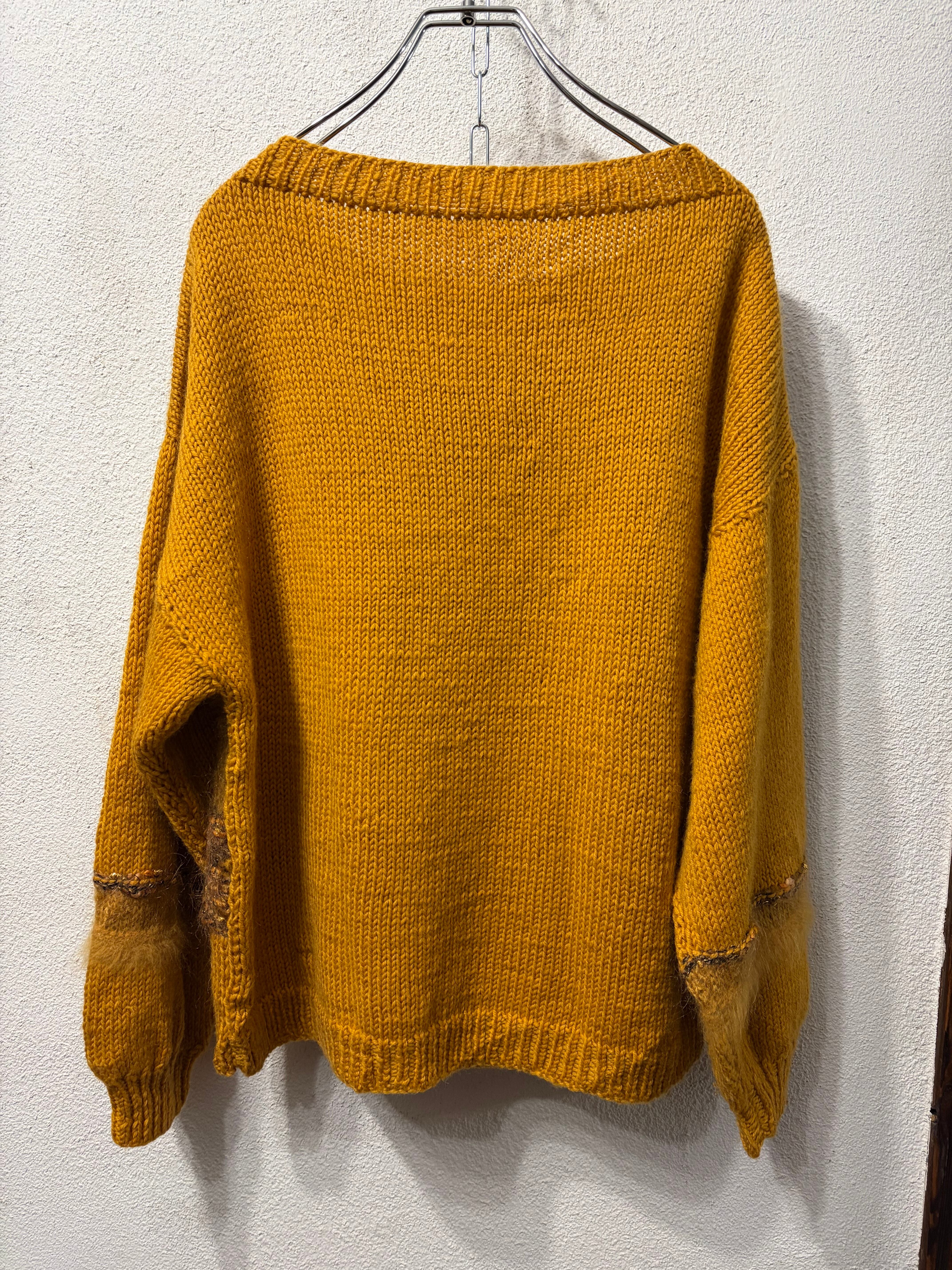 マスタードカラーに異素材の毛糸が混じったハンドニットセーター。