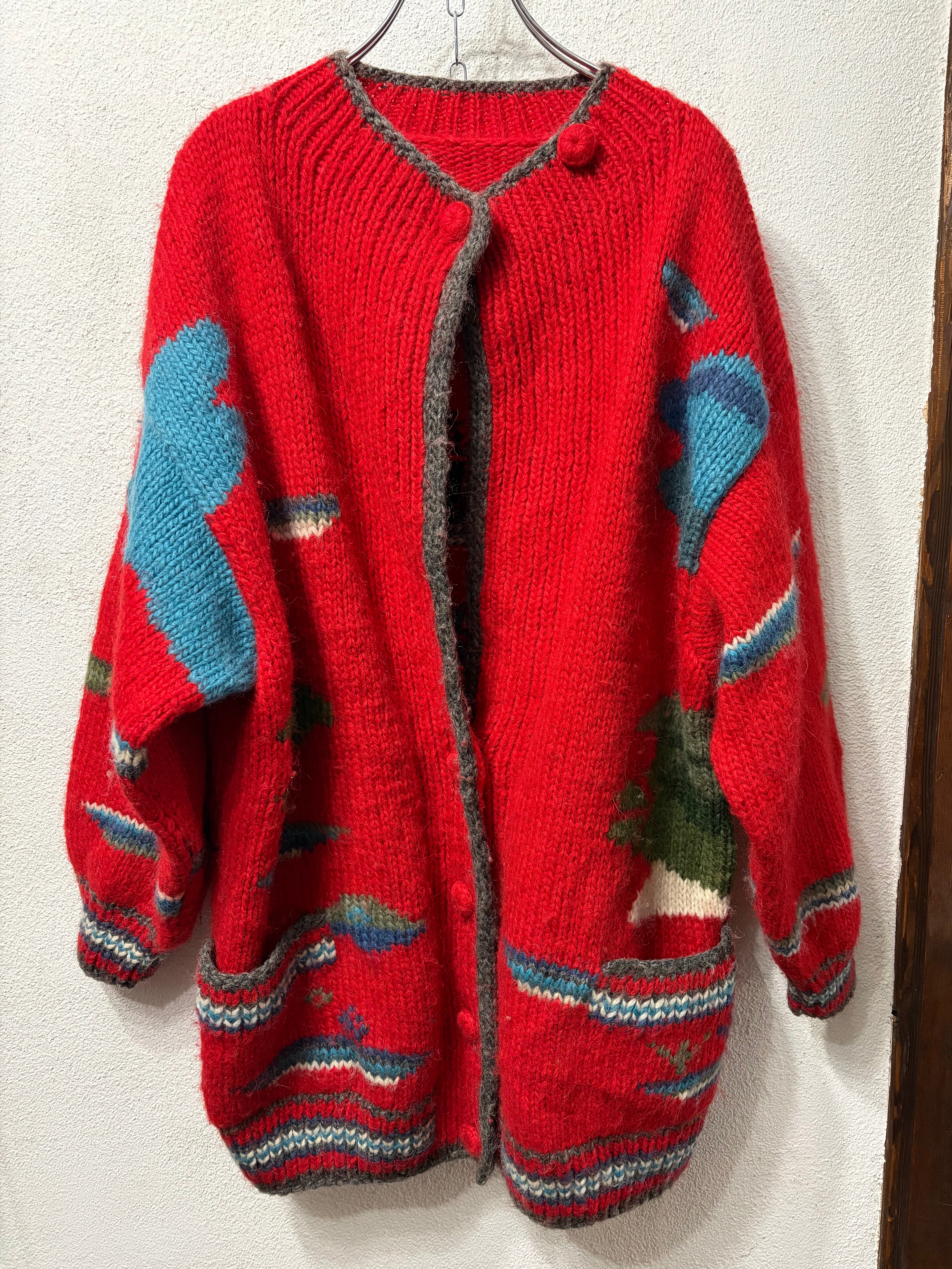家や木などのデザインが編まれたカーディガン。