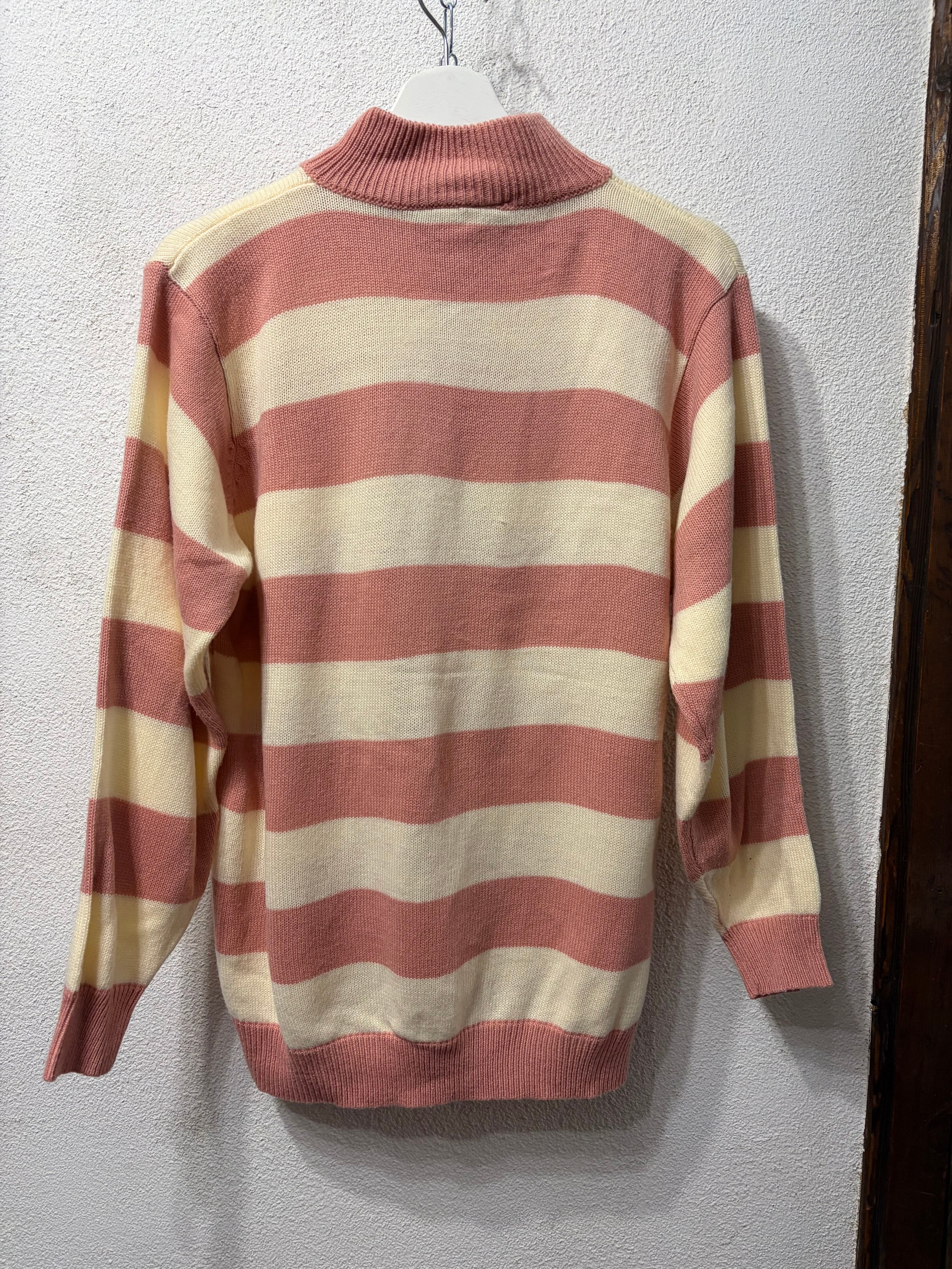 薄いピンクカラーとアイボリーのボーダー柄セーター。