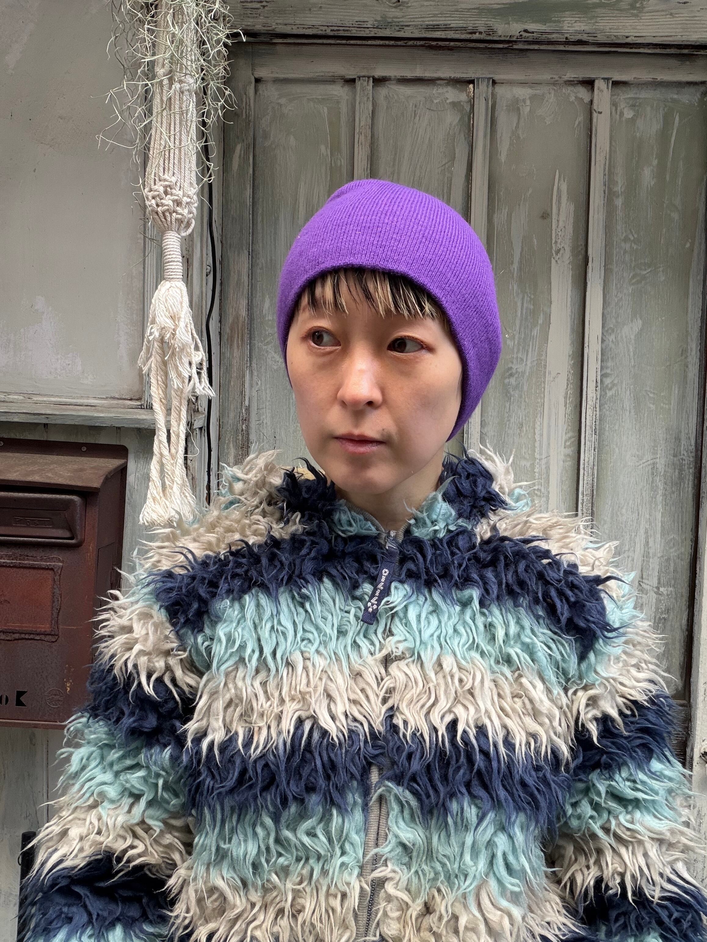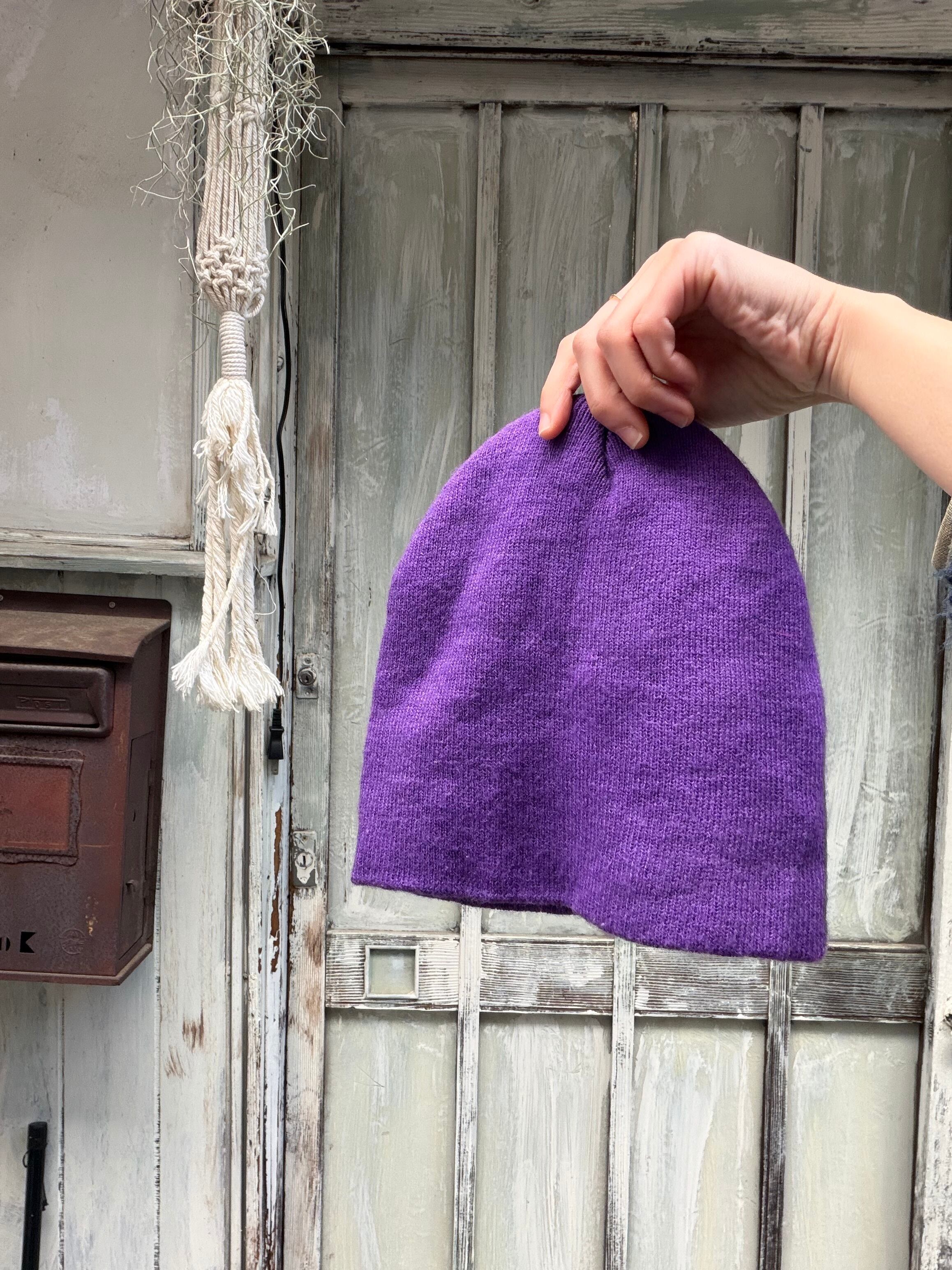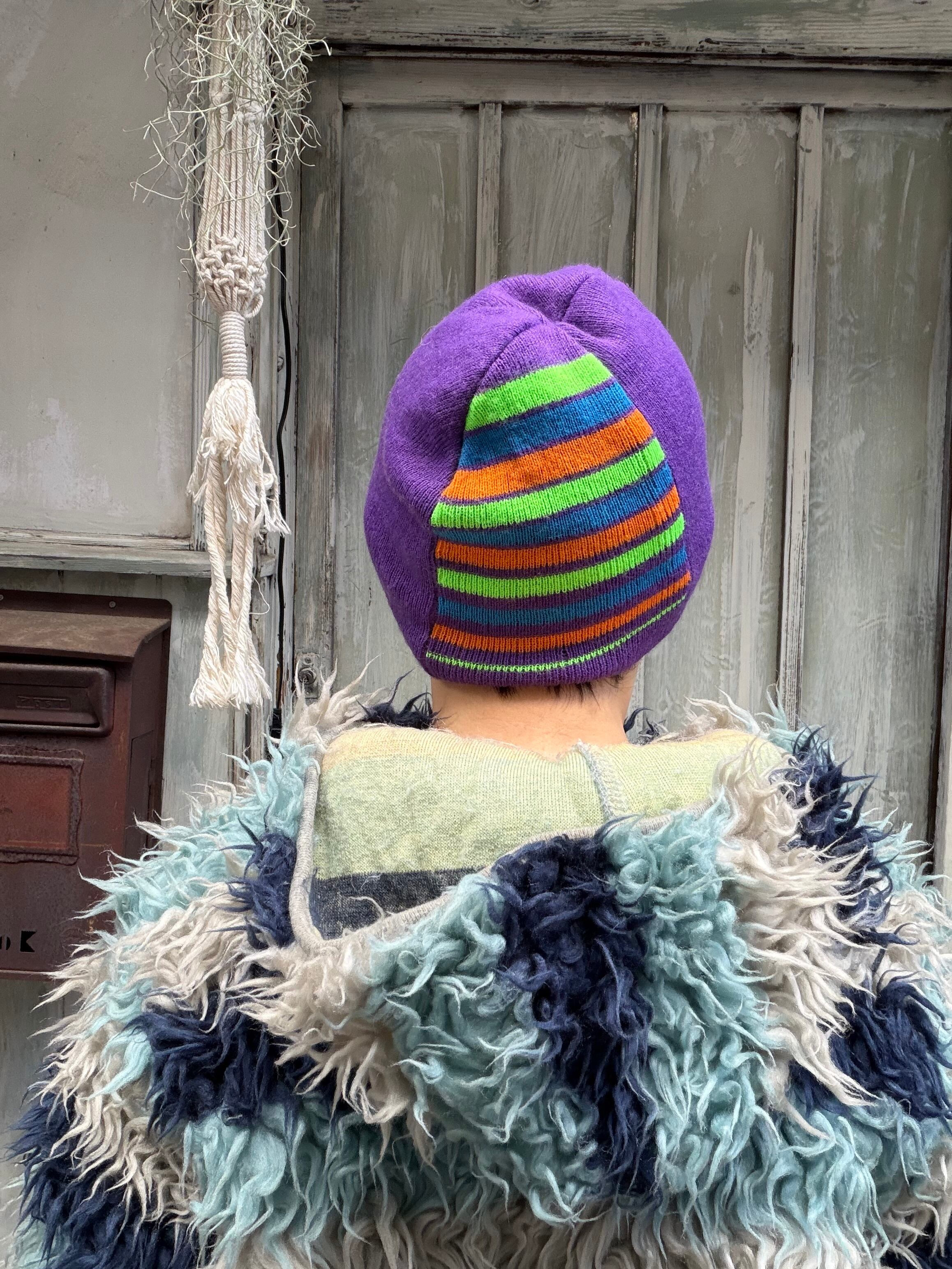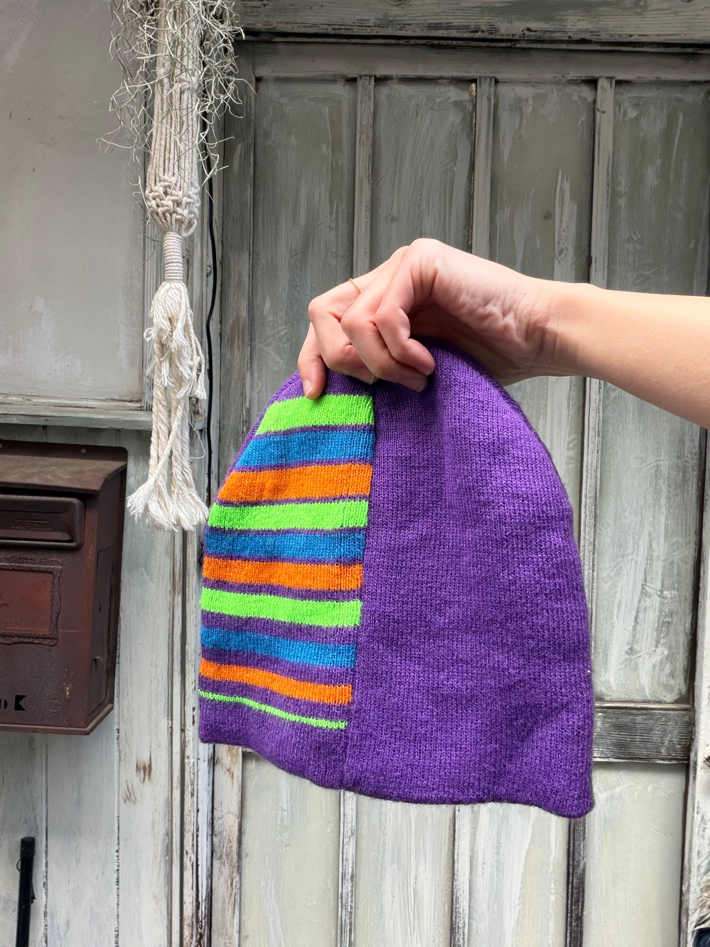 紫カラーにカラフルなボーダーデザインが入ったニット帽。