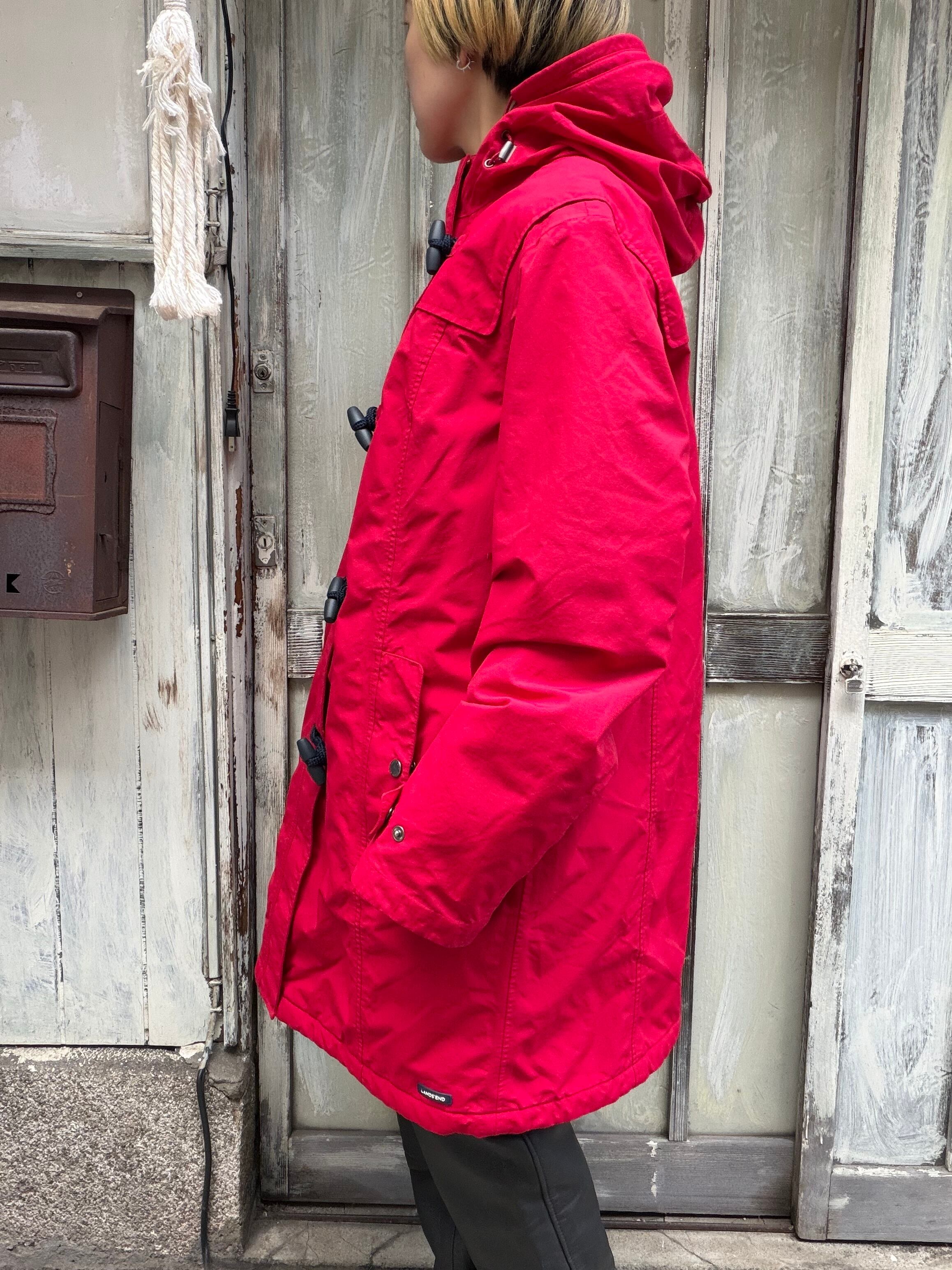 真っ赤な色、ランズエンド、ダッフル、表はナイロン。