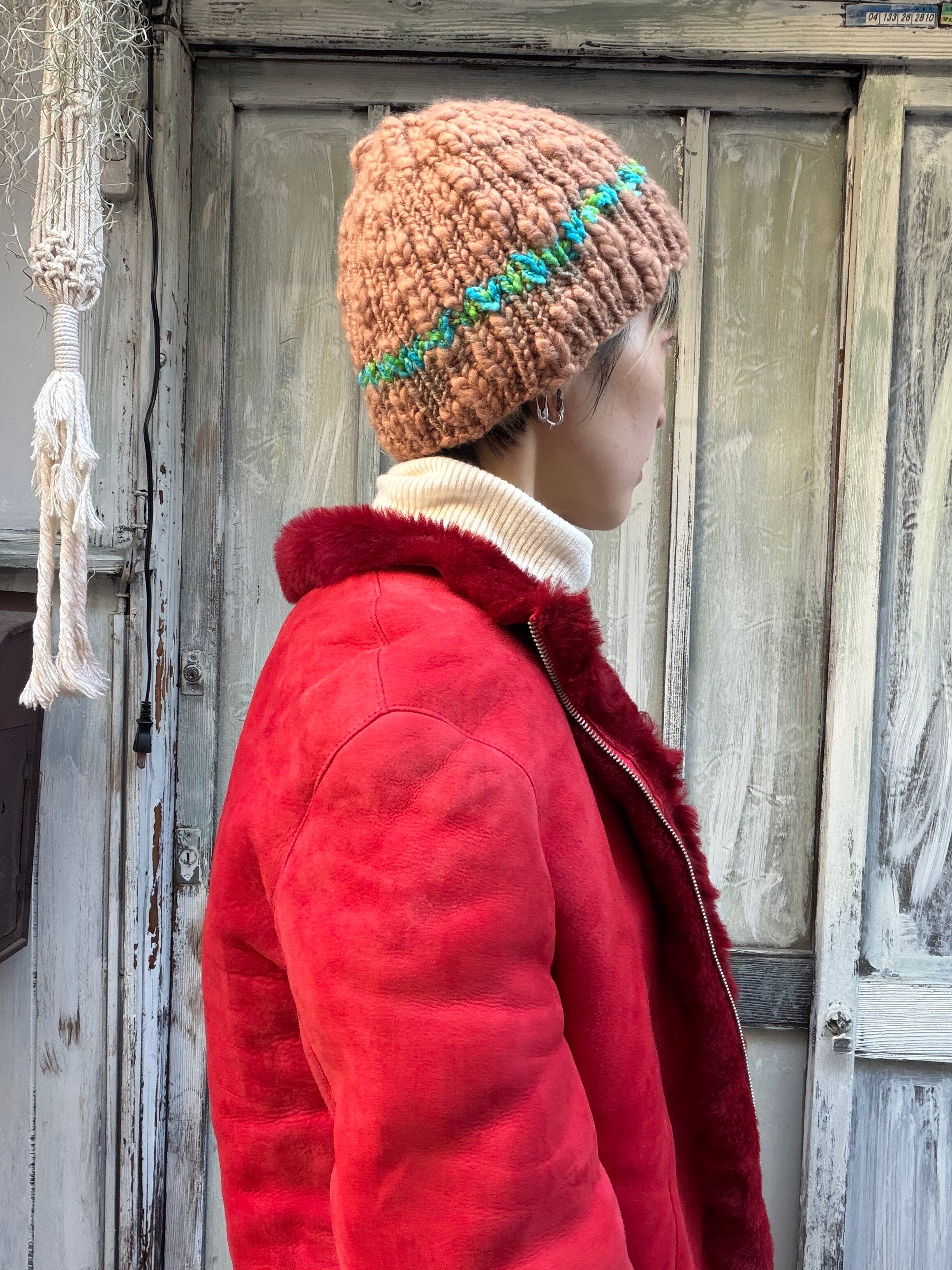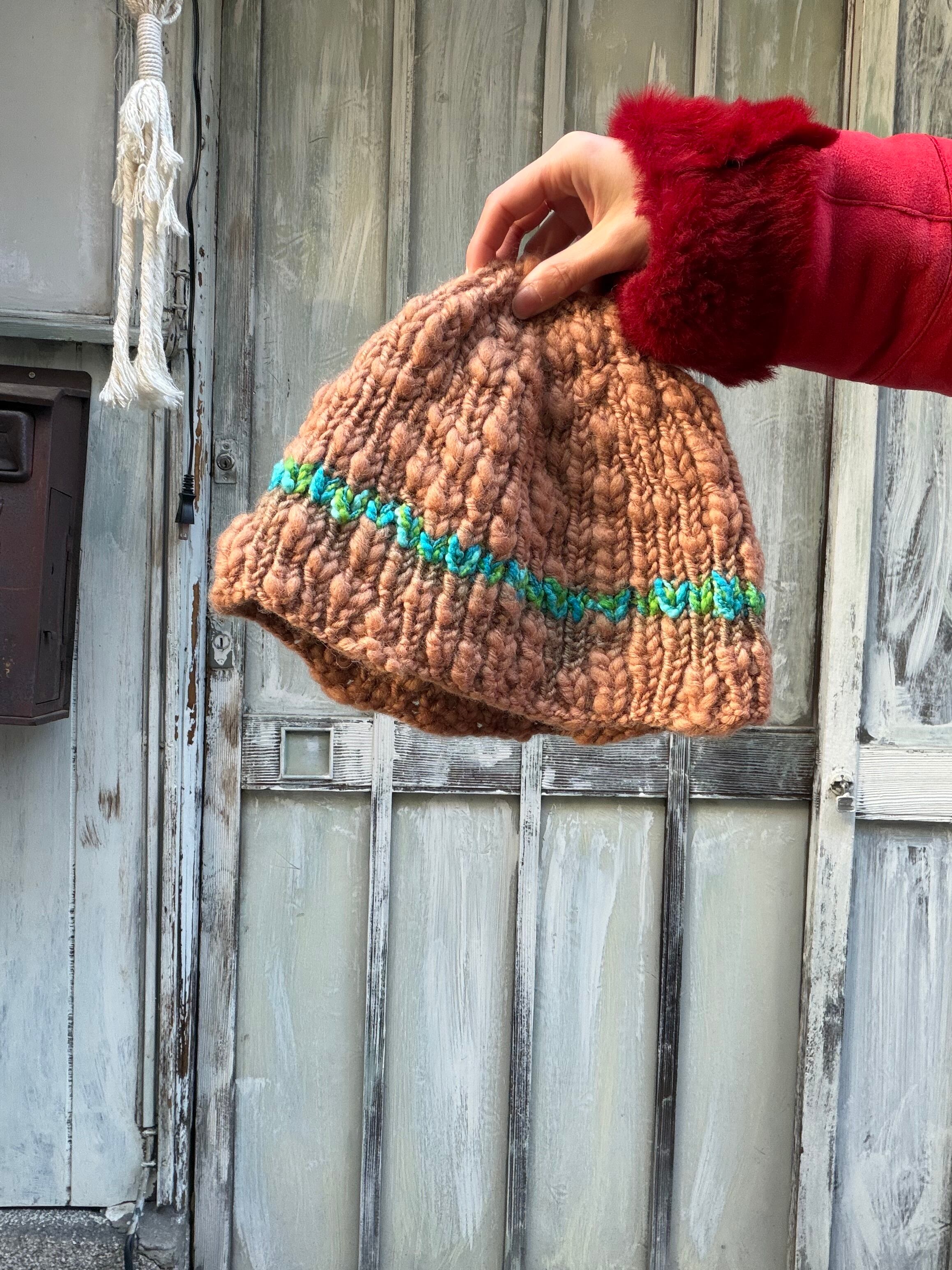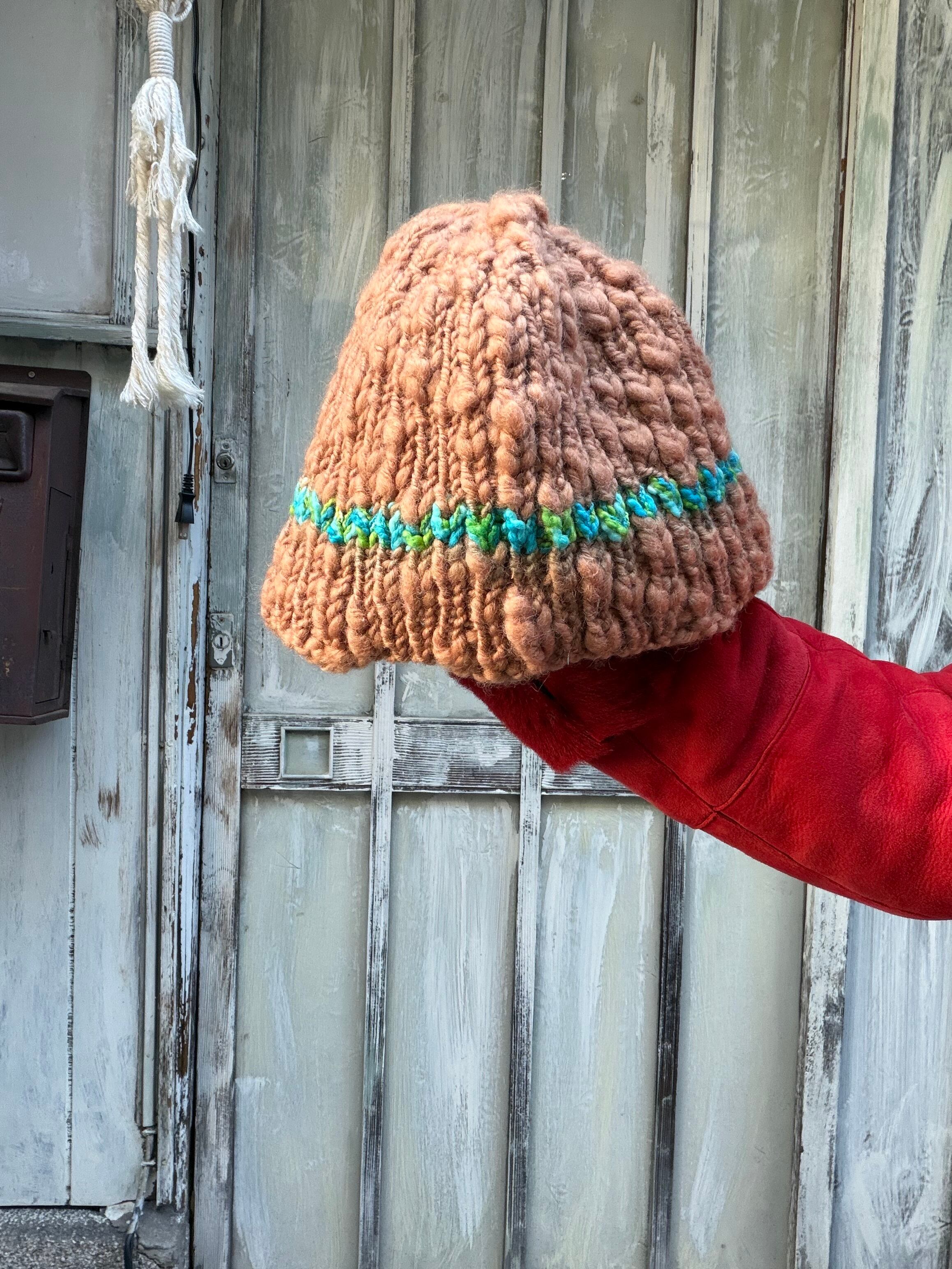 キャメルカラーはグラデーションラインが入ったビーニー。