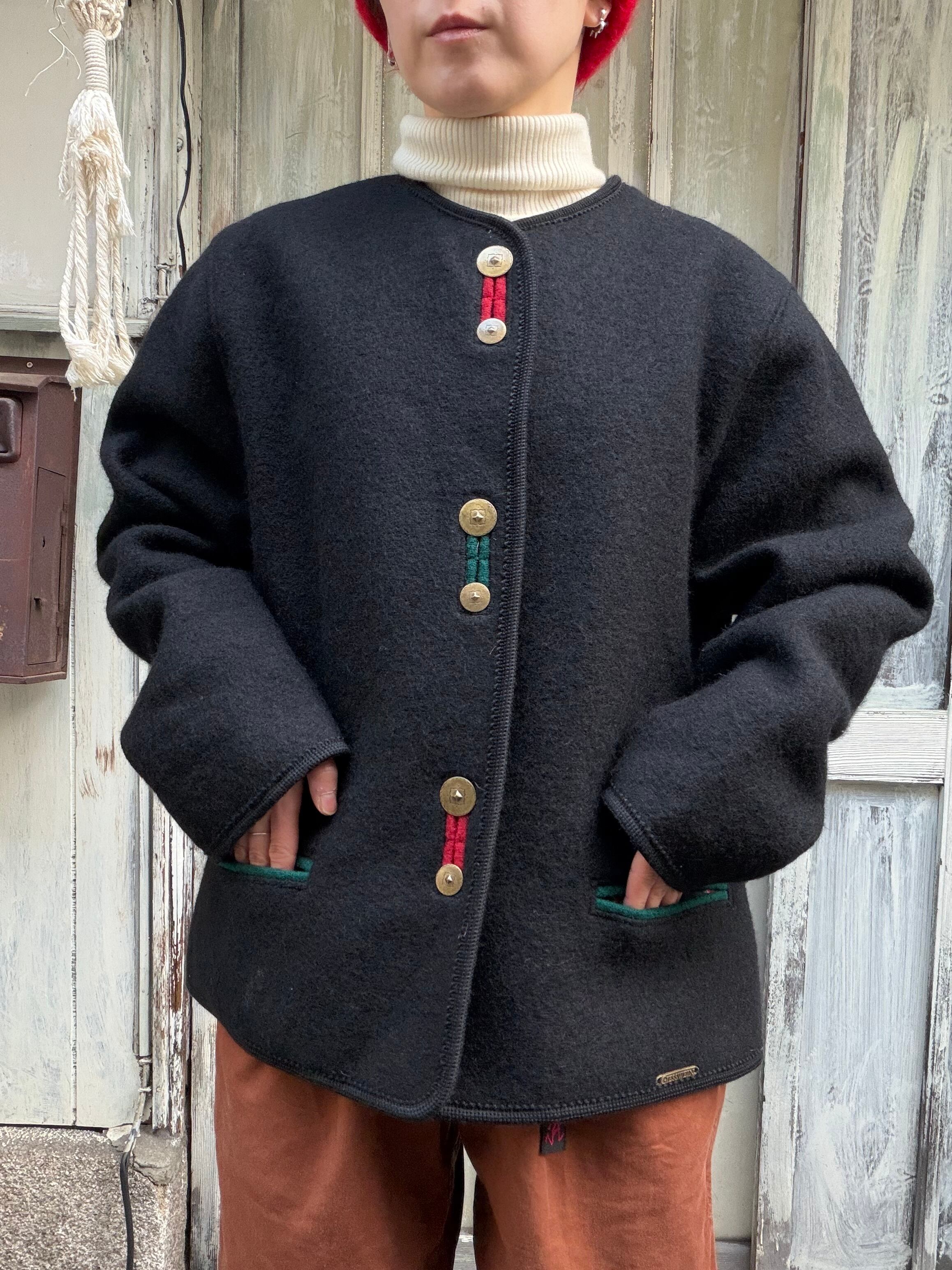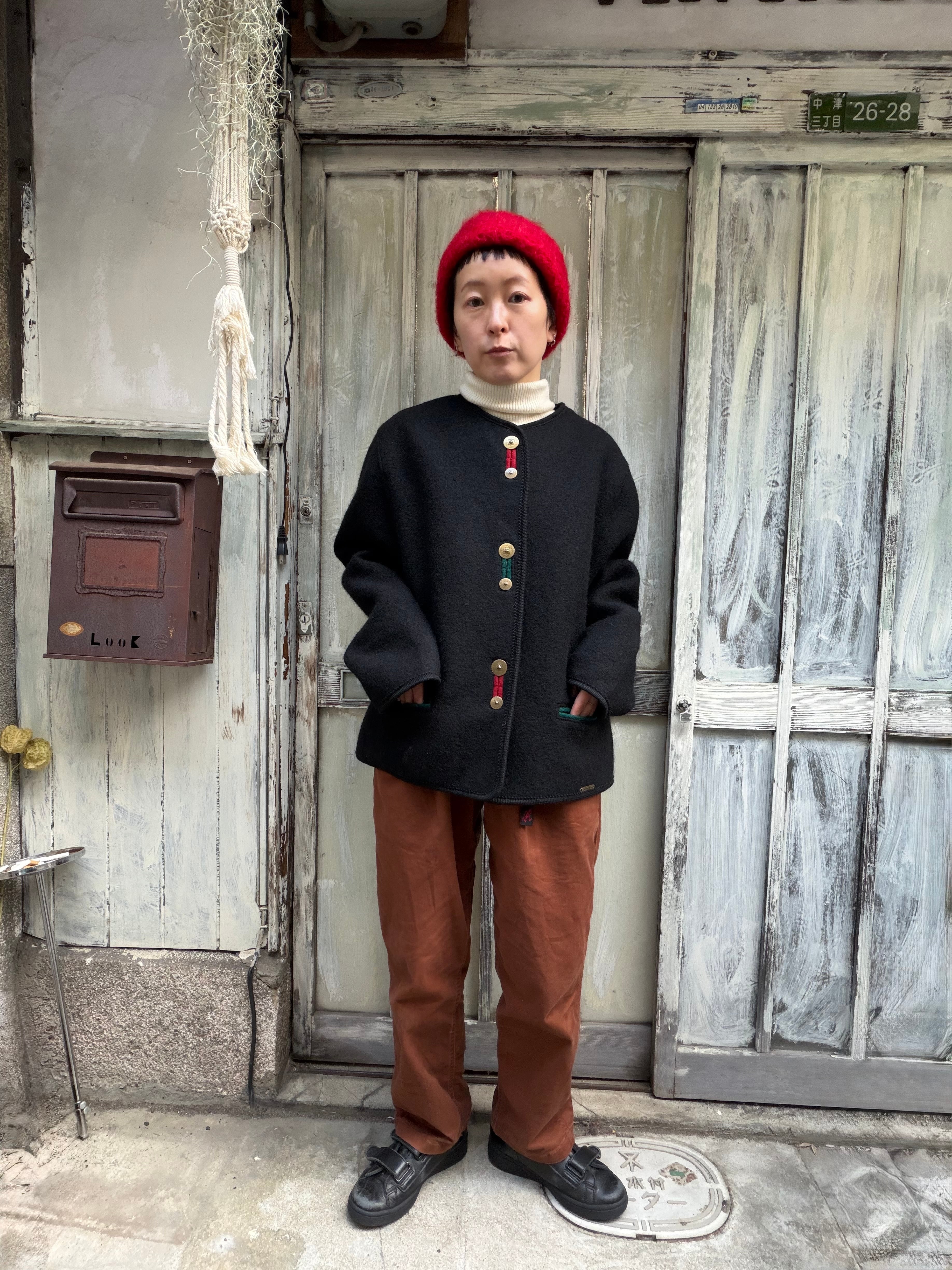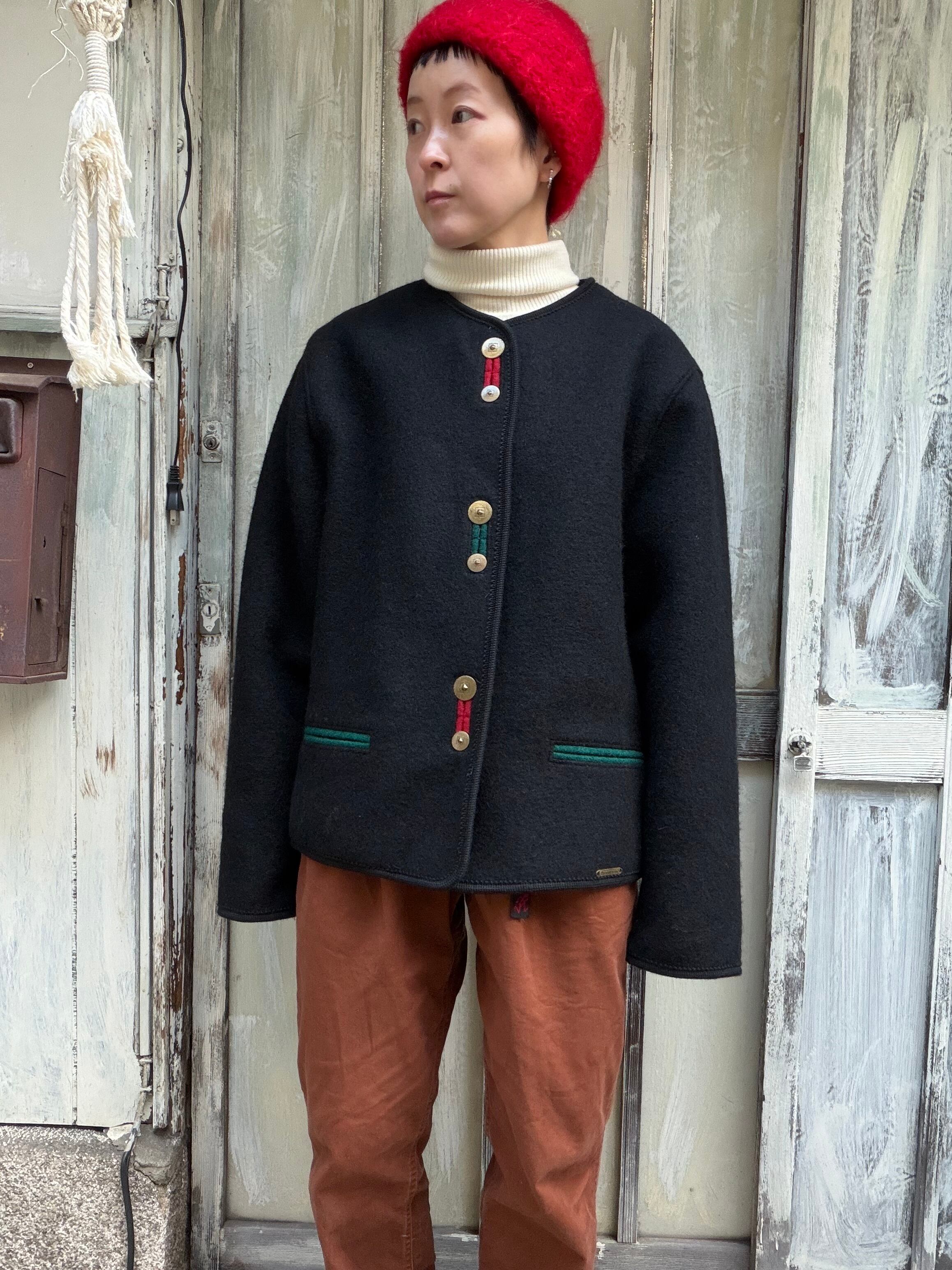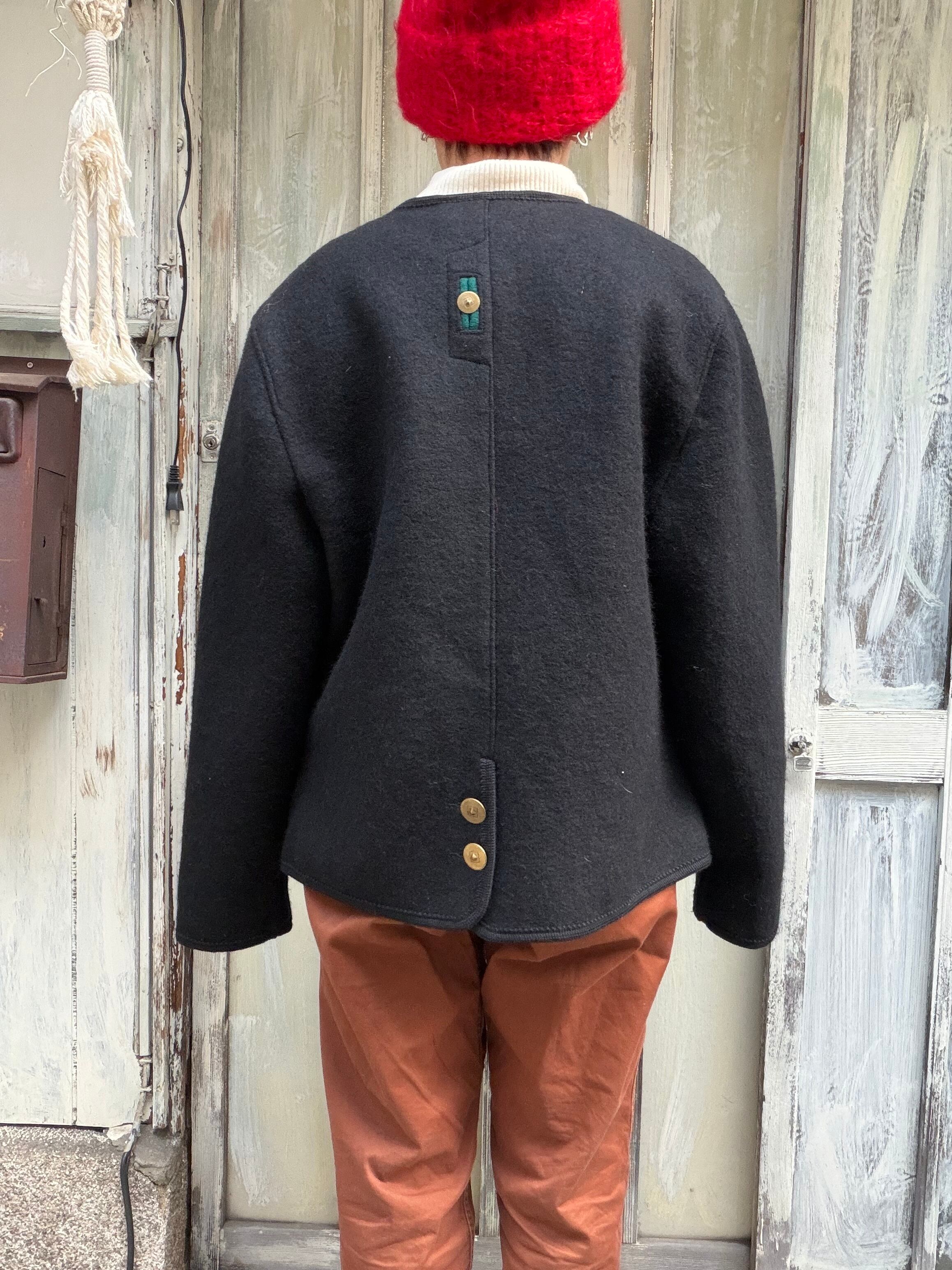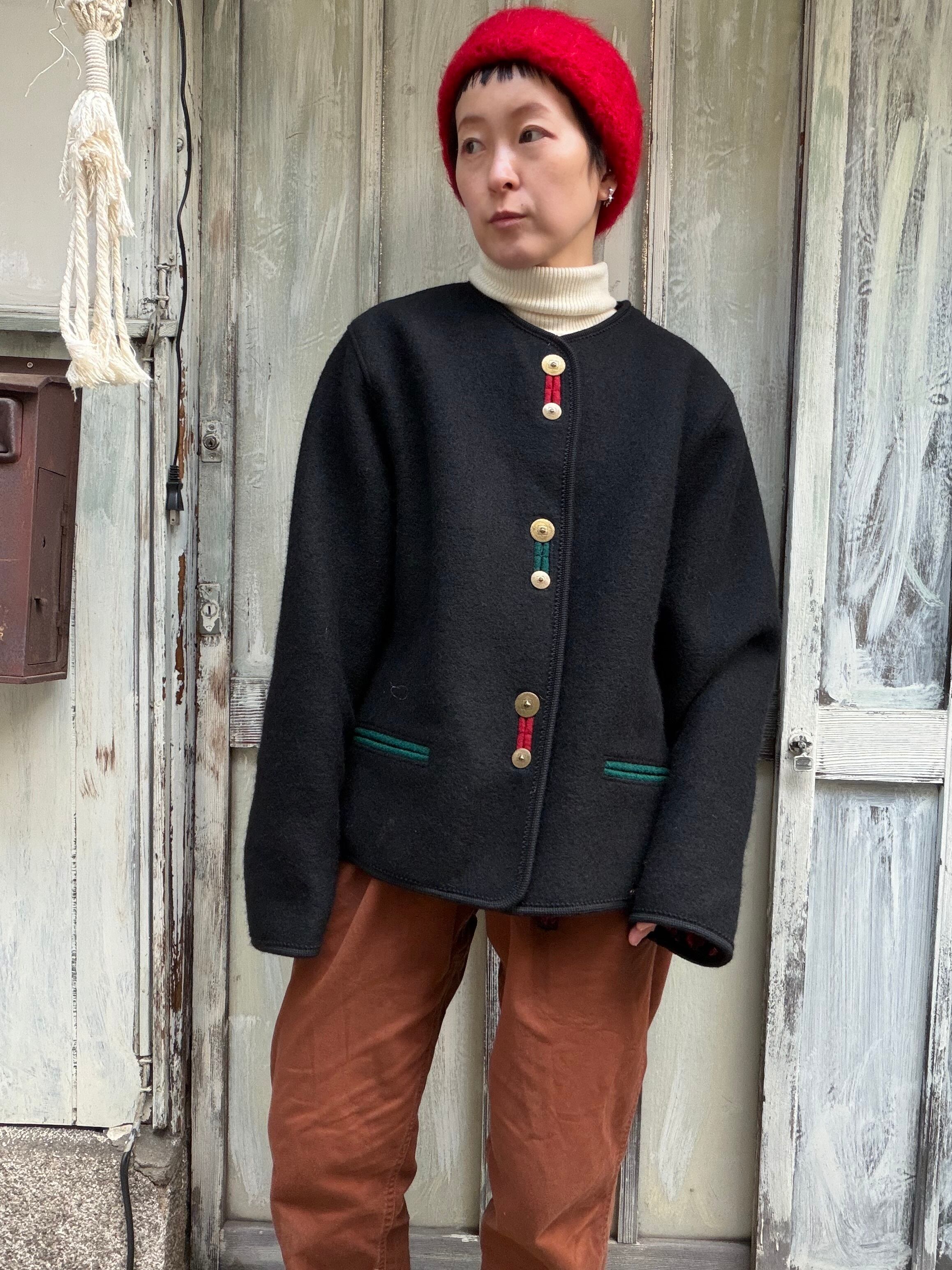デザインが特徴的なノーカラーのウールジャケット。