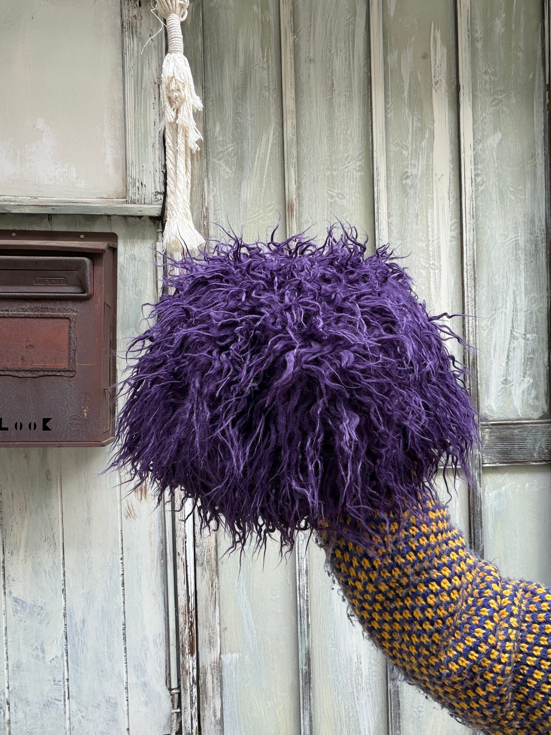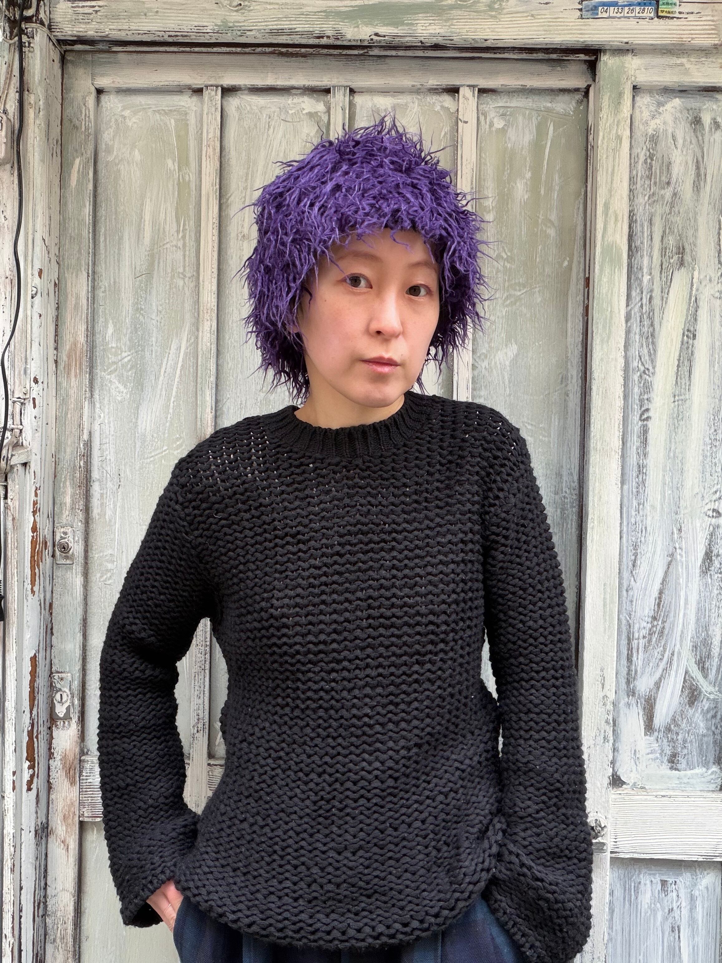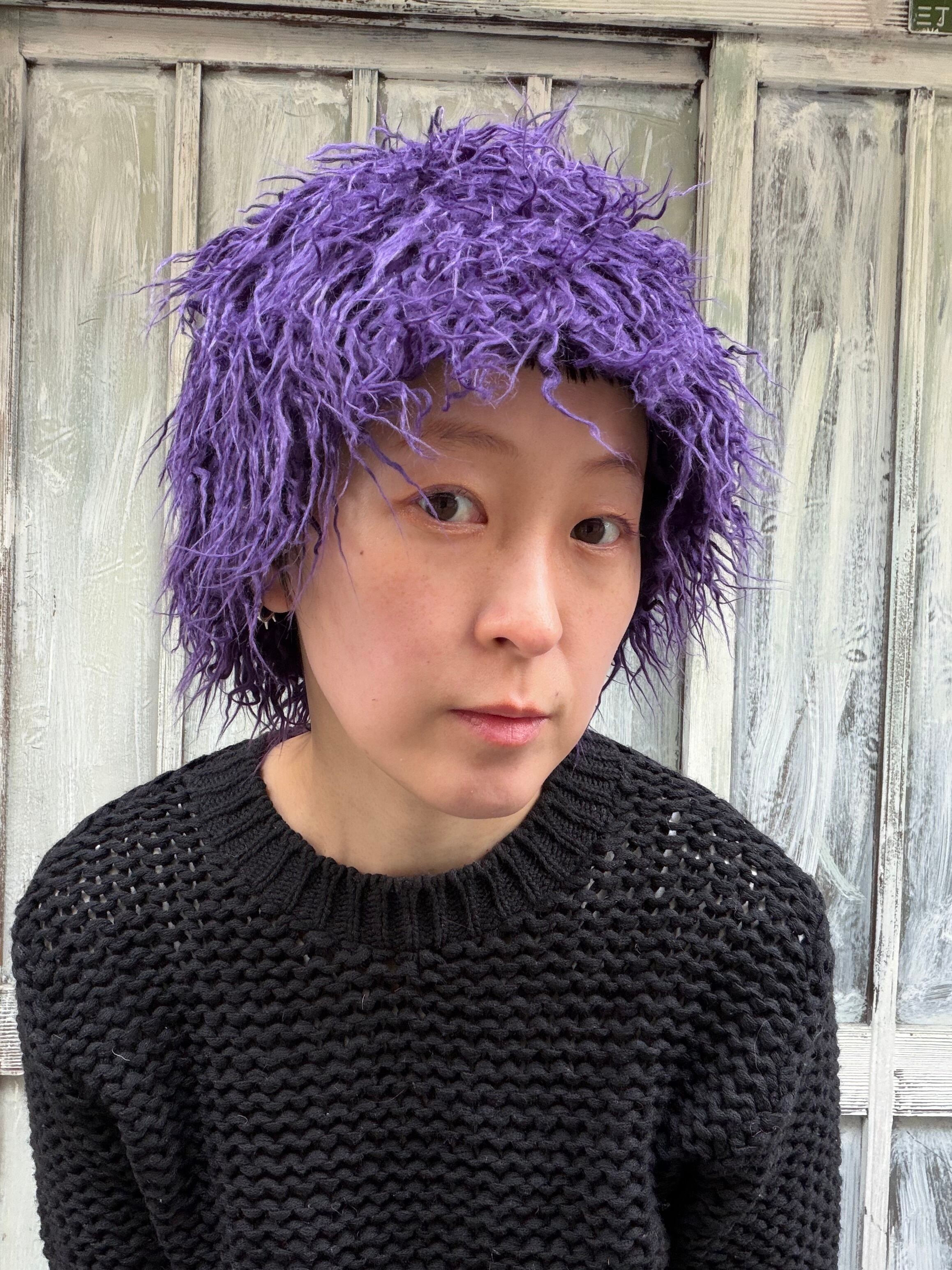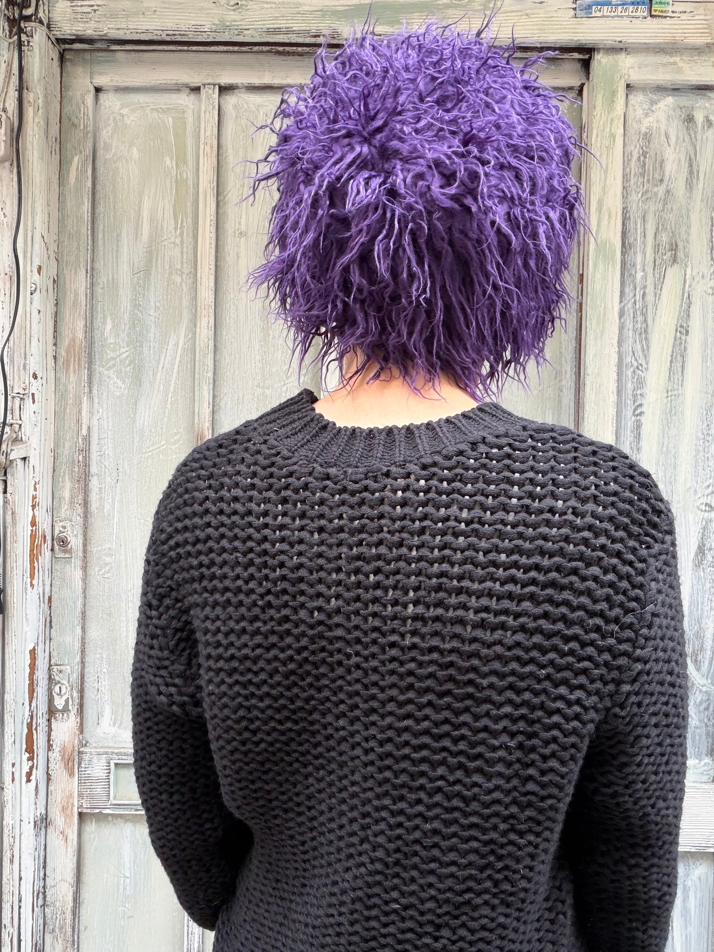 purple shaggy knit beanie hat