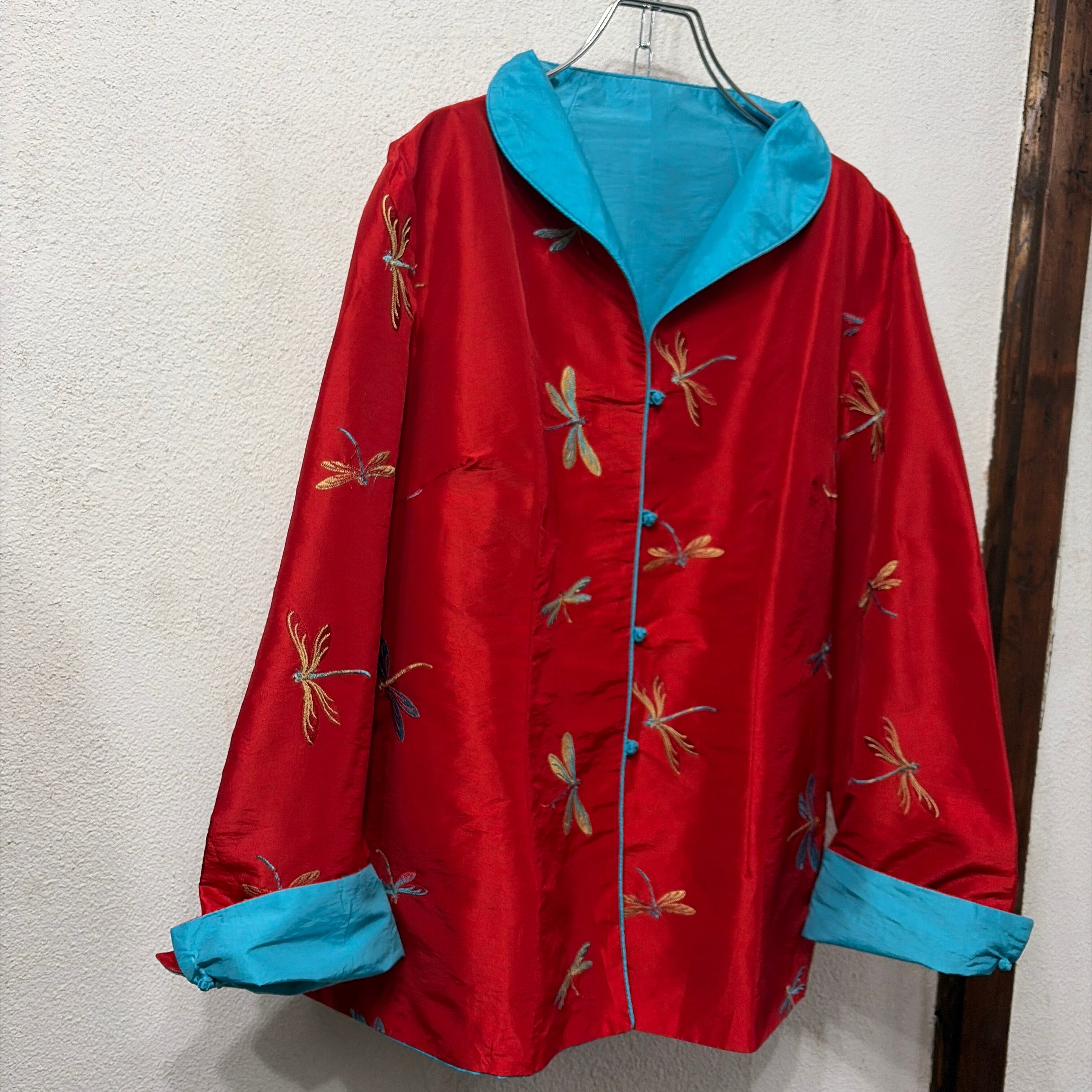 赤にトンボ刺繍、反対はブルーの無地デザインです。
