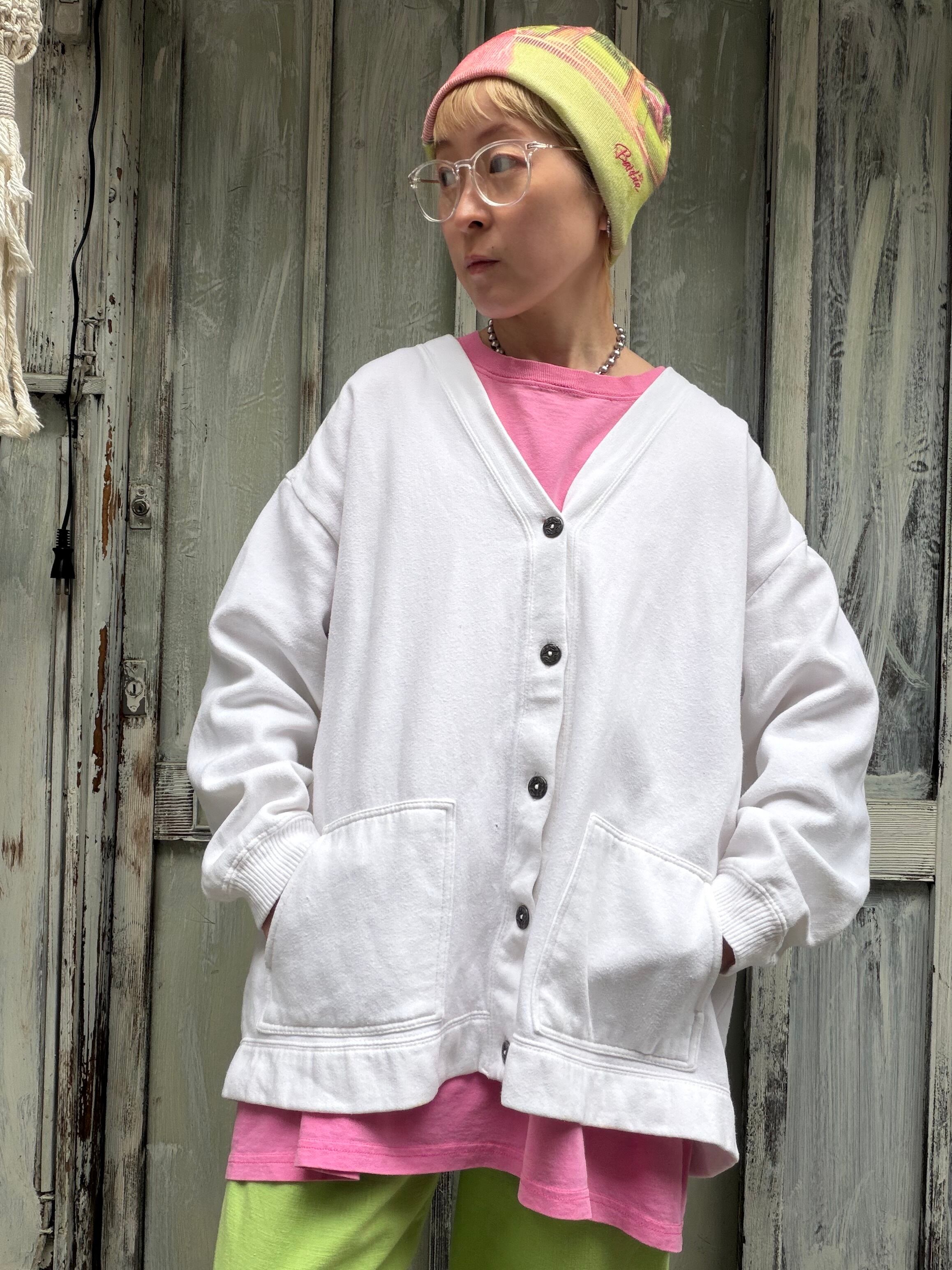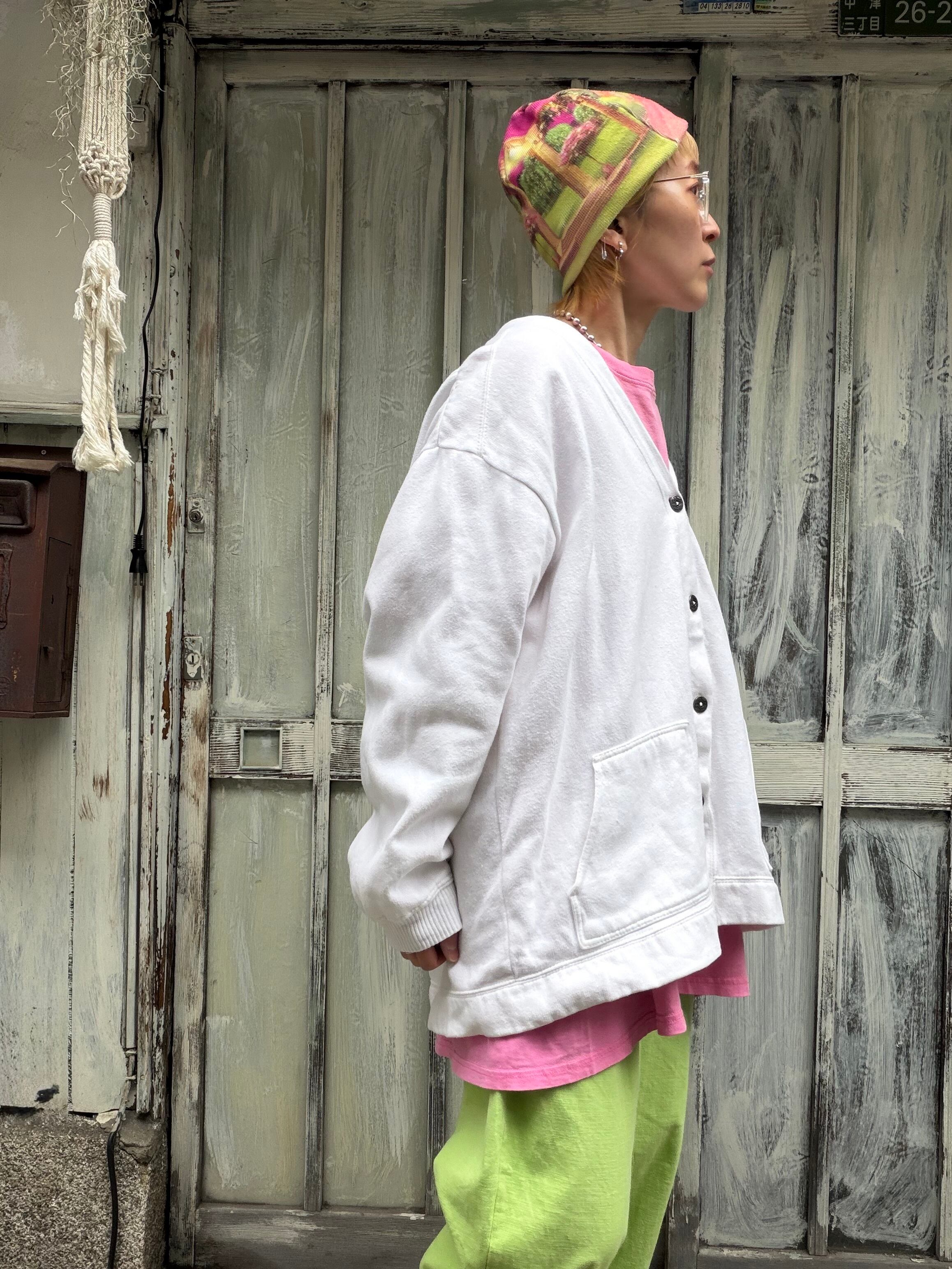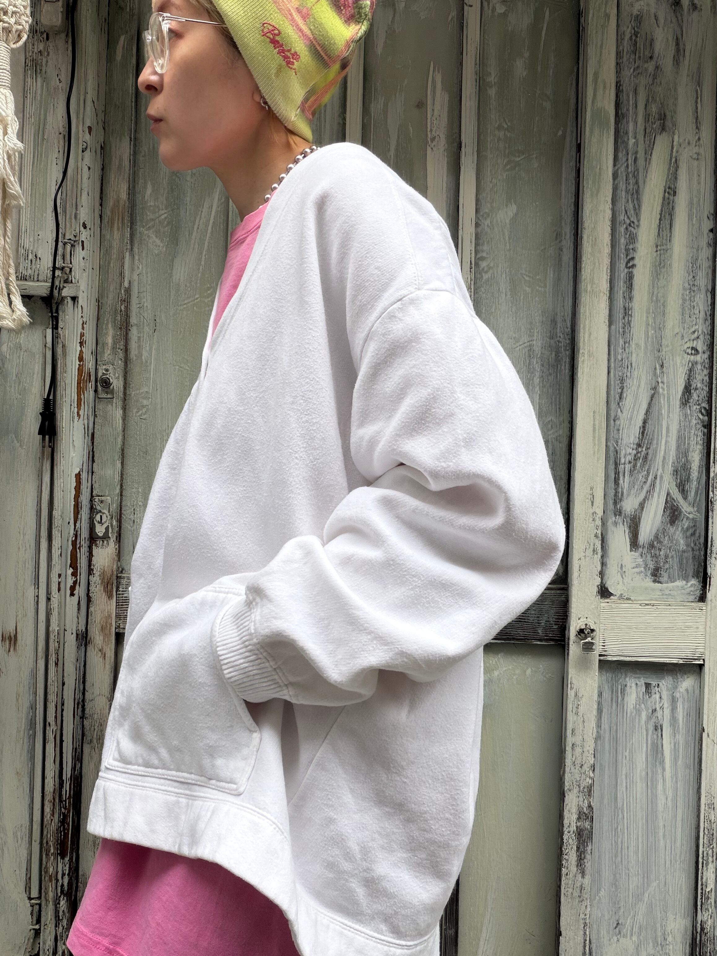 白のスウェットカーディガン。