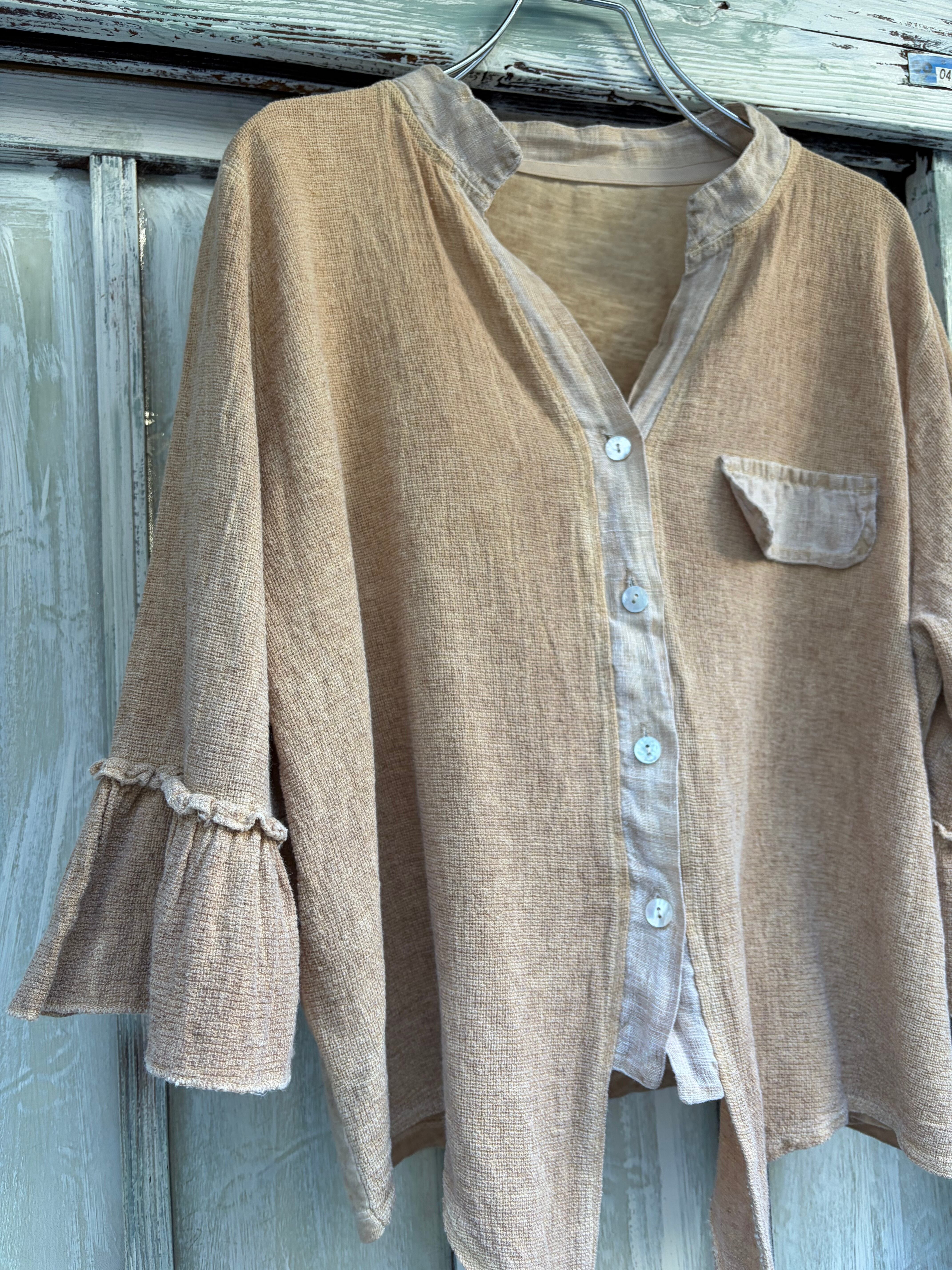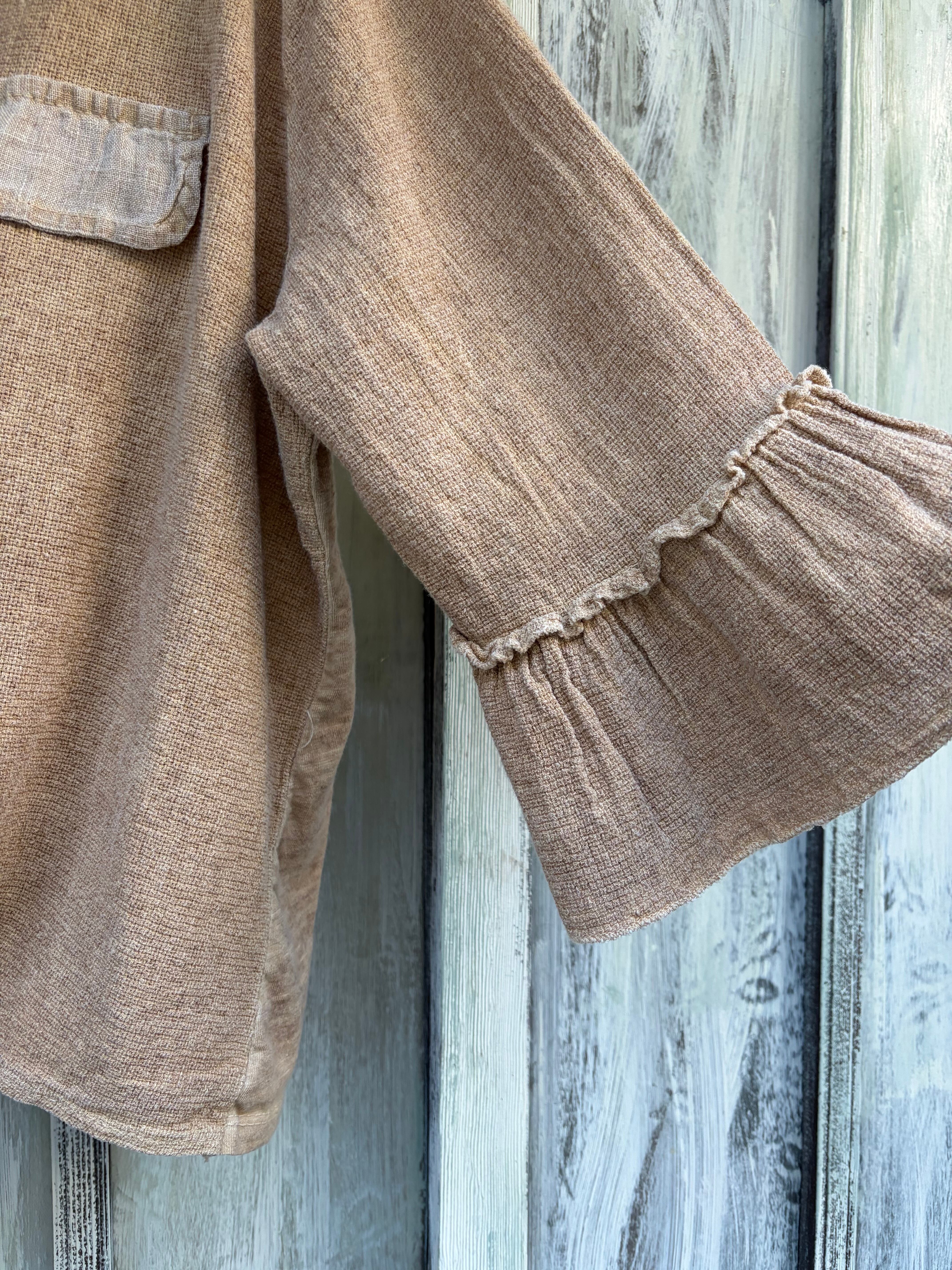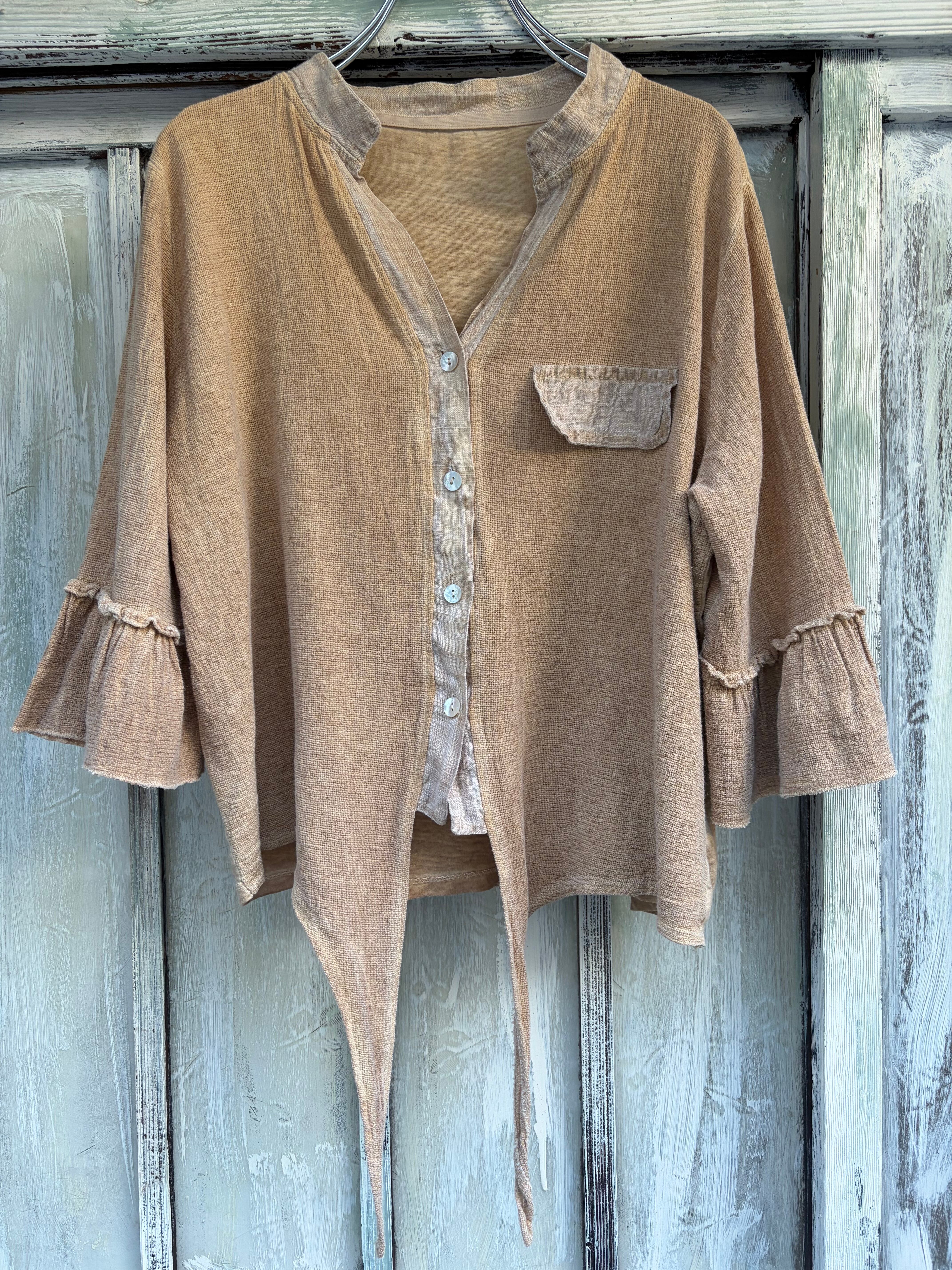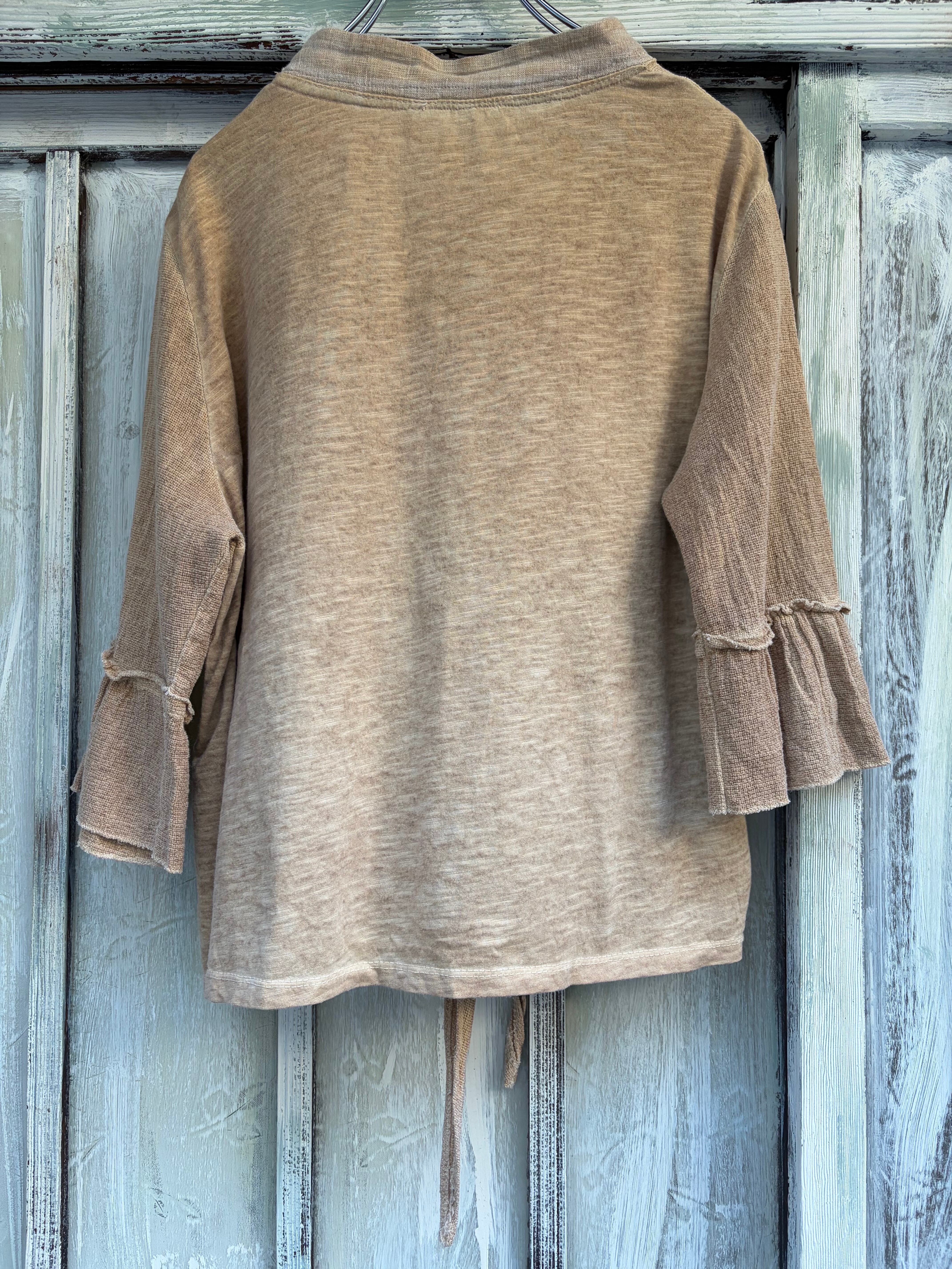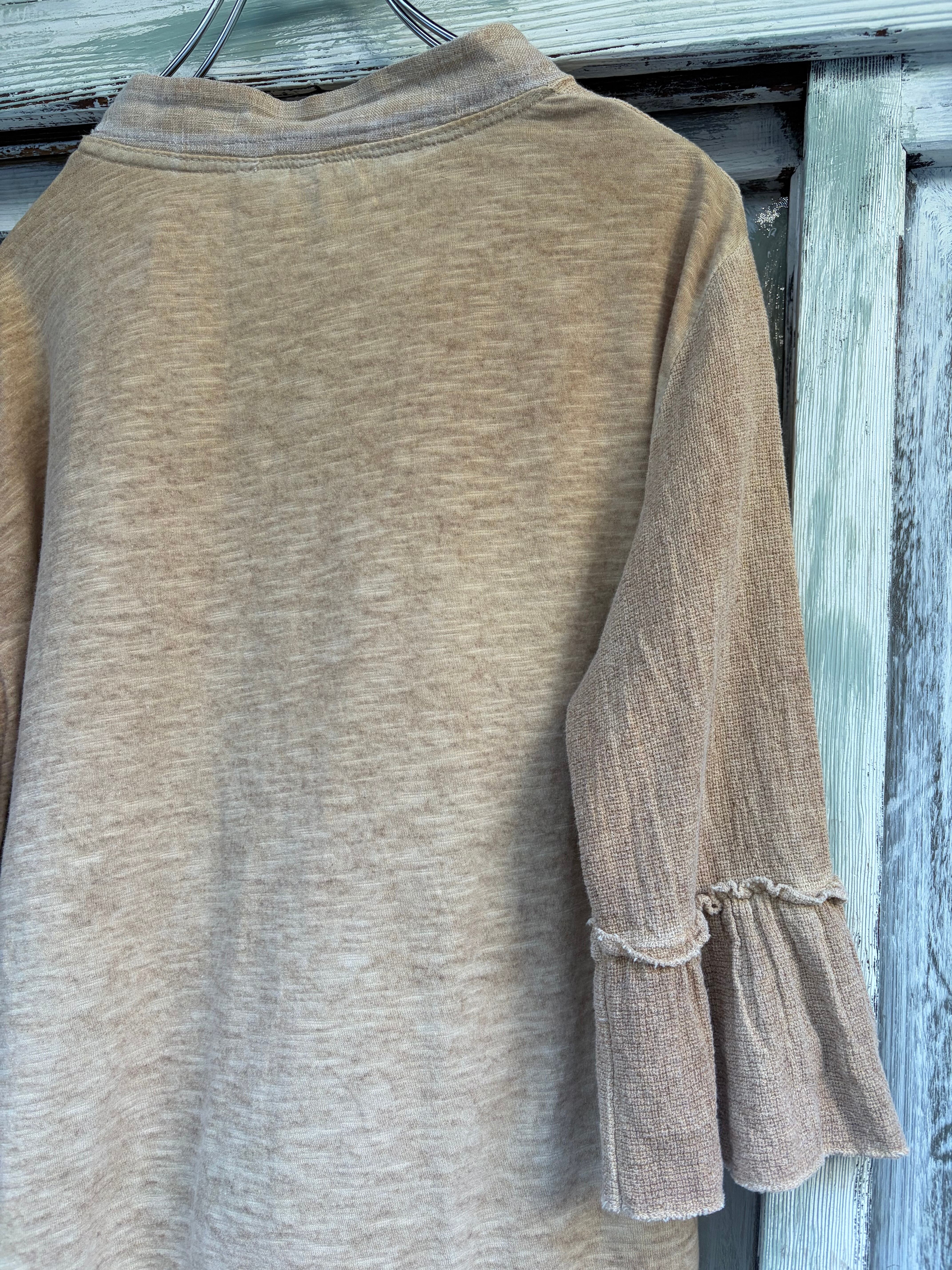 後ろはカットソー素材、前は麻のような素材、そして裾はフレアタイプ。