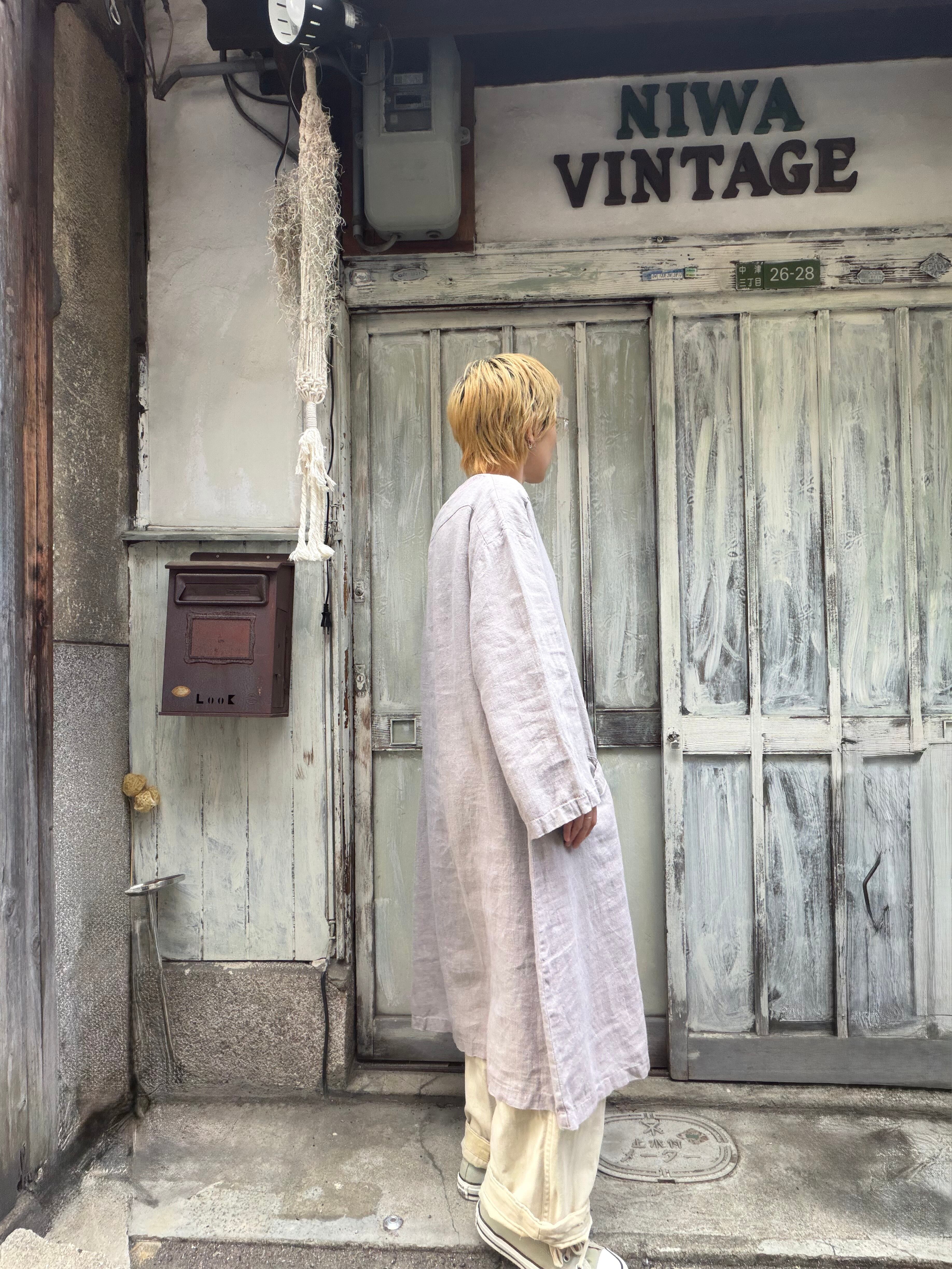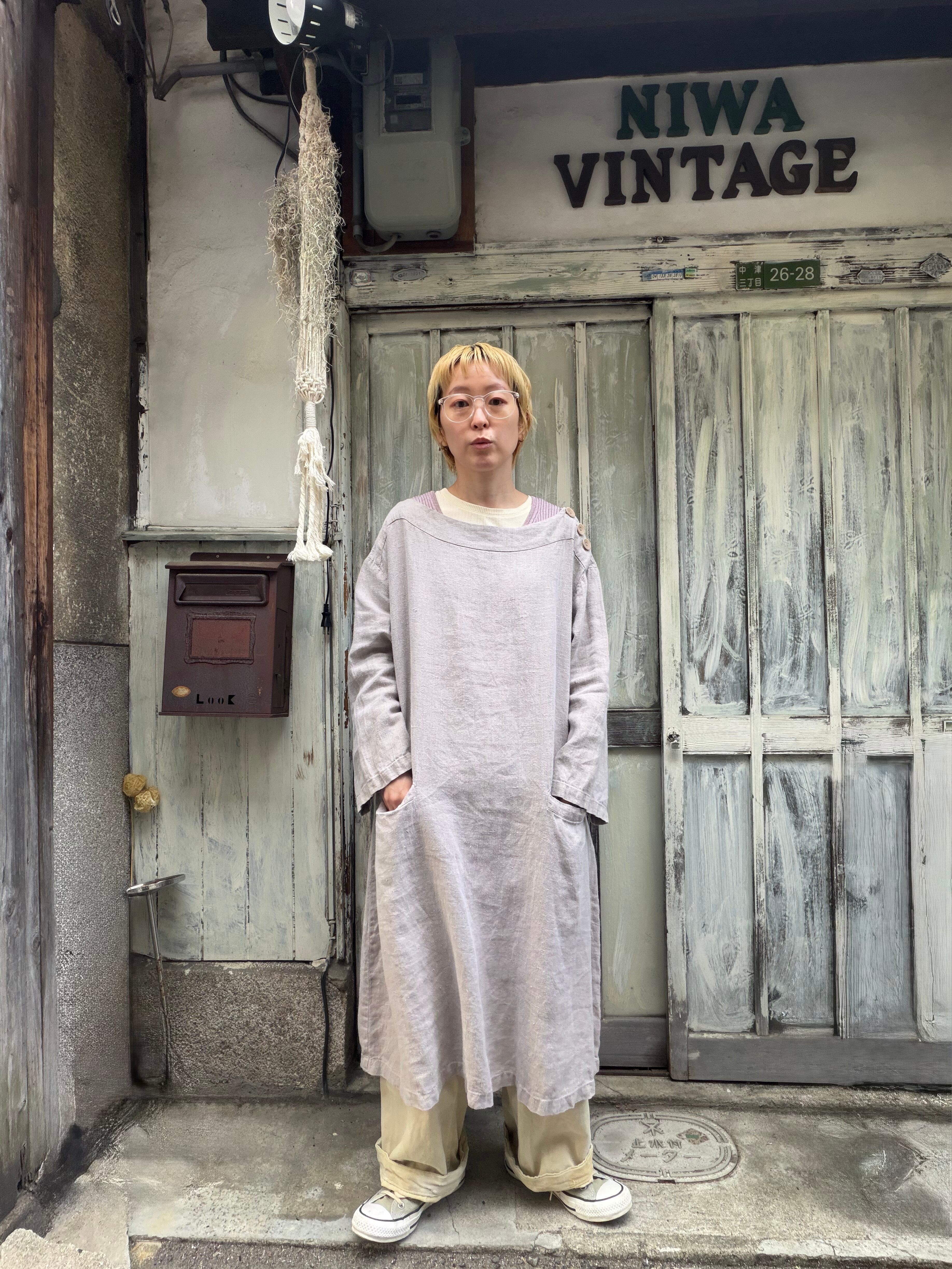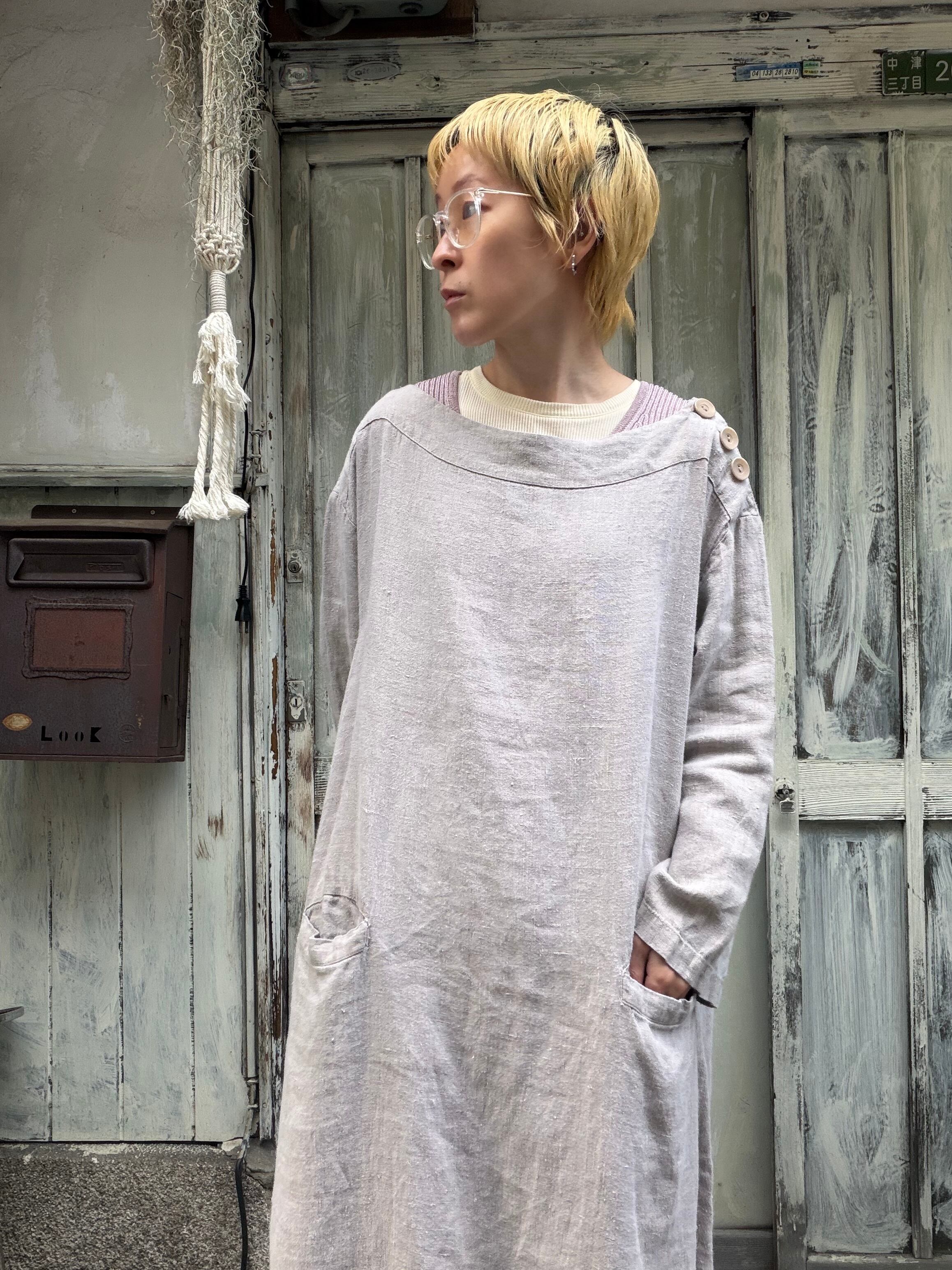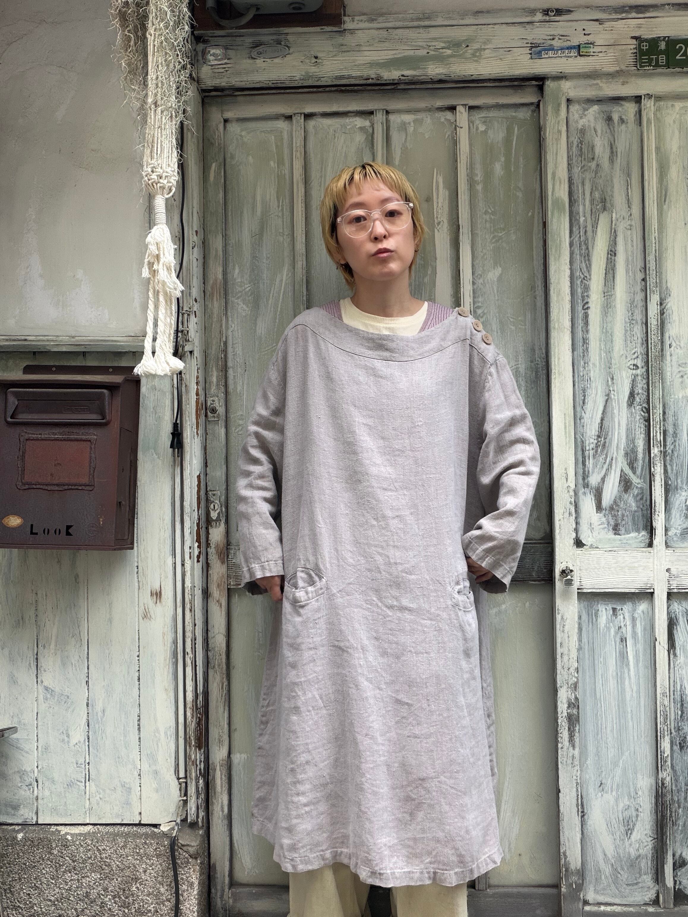 FLAXのリネンベージュカラーワンピース。
