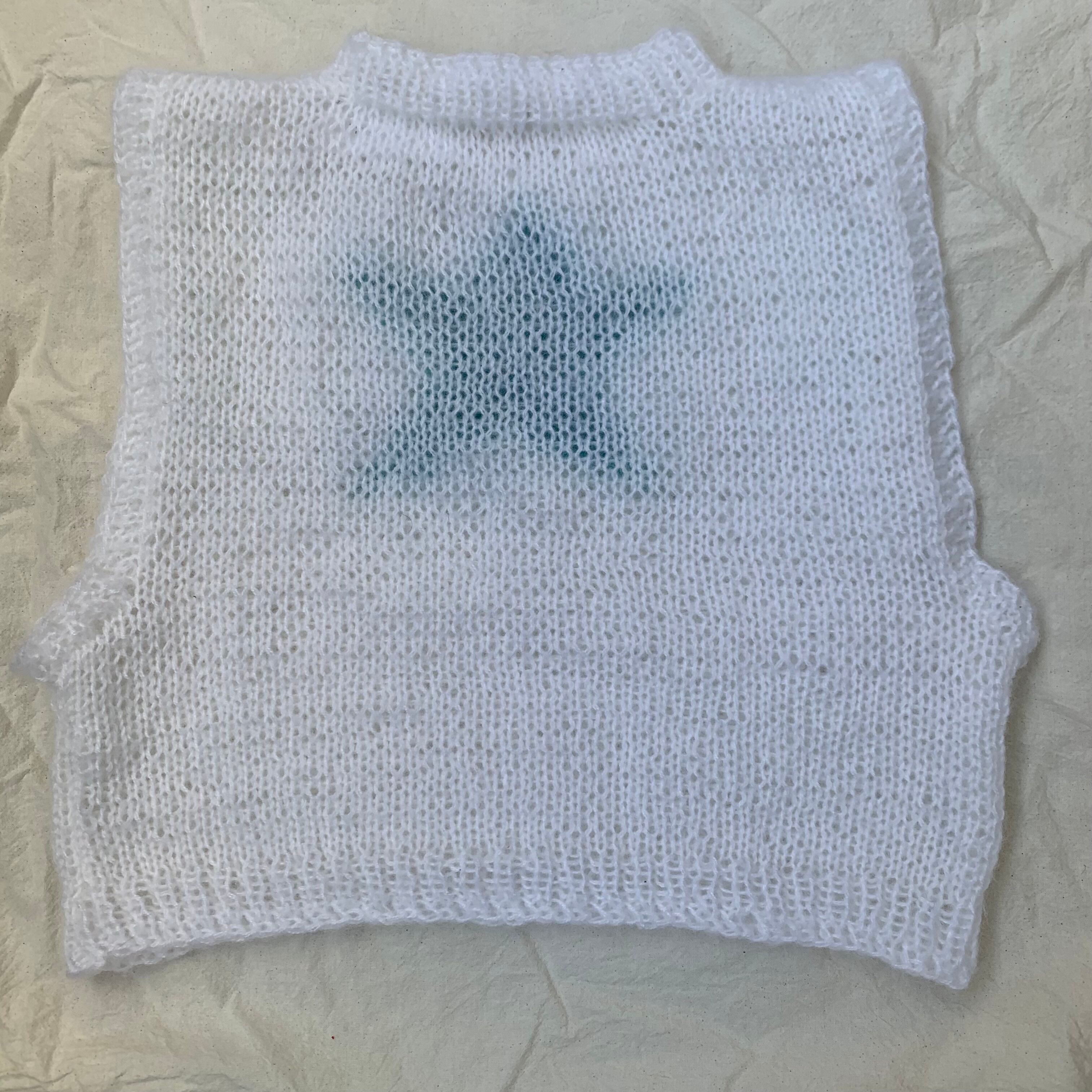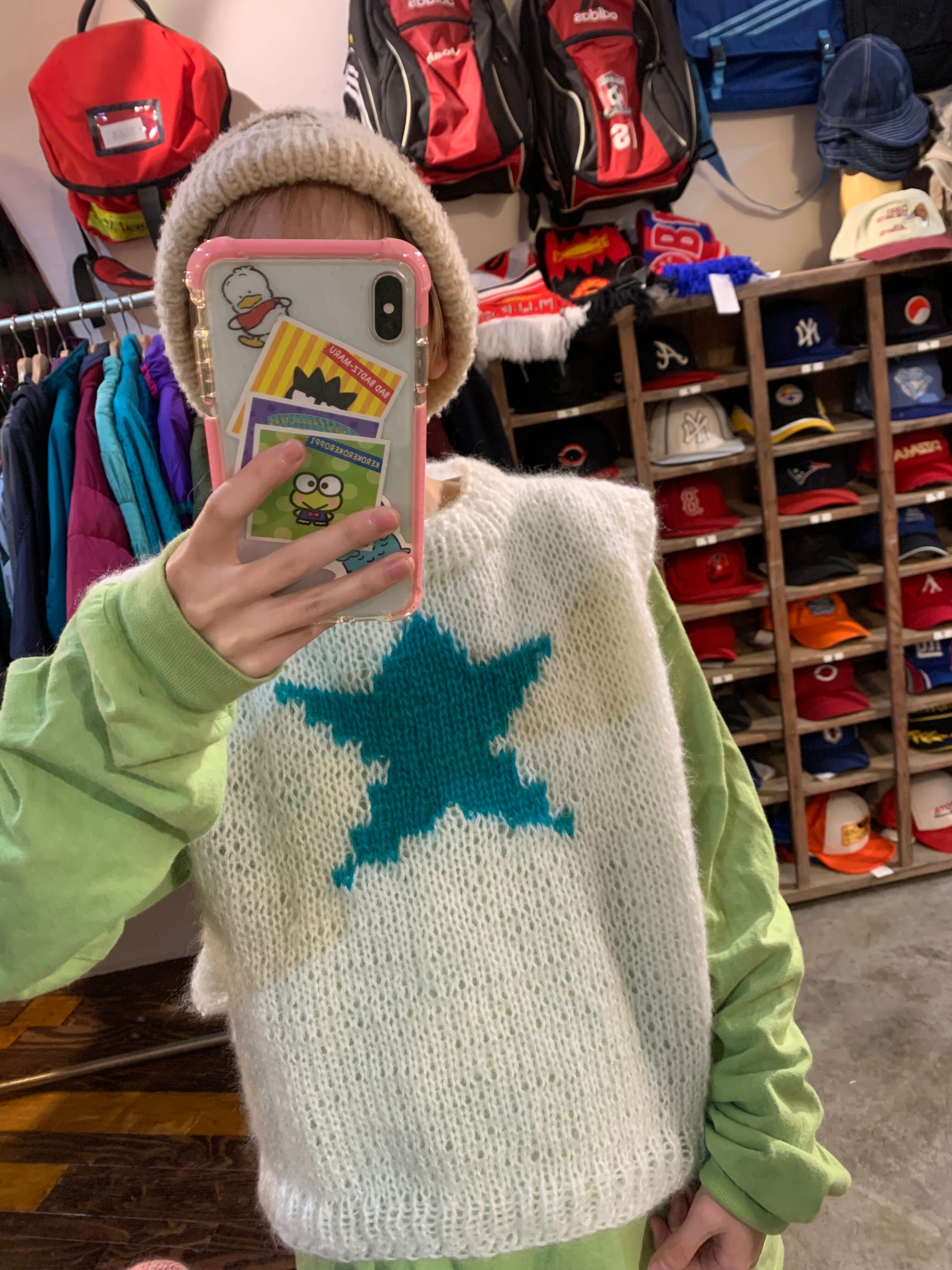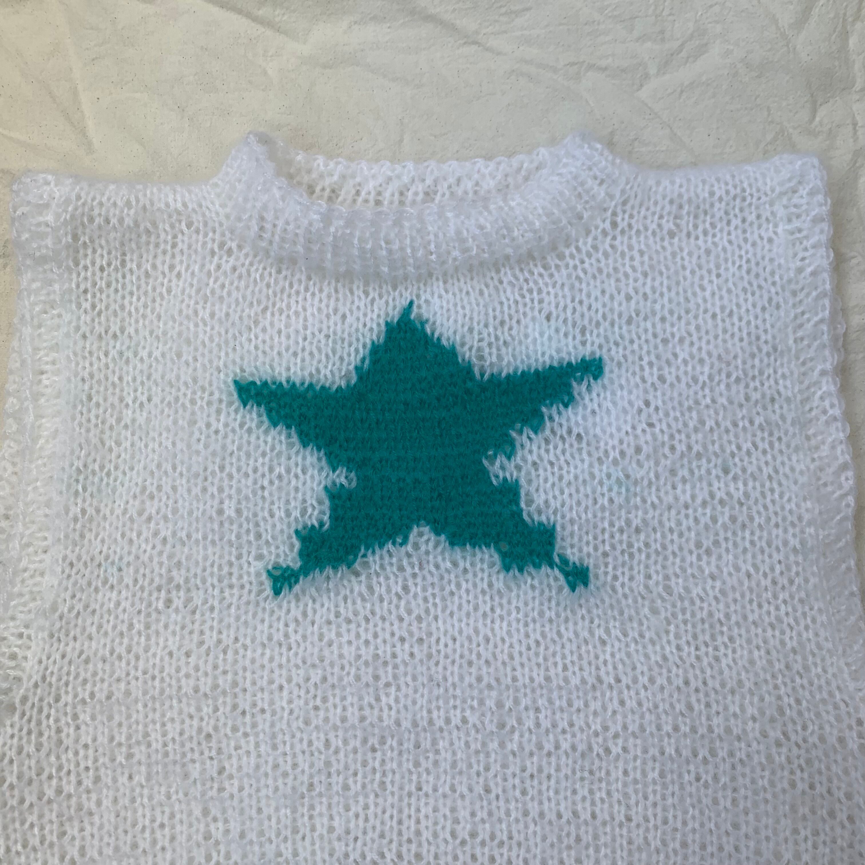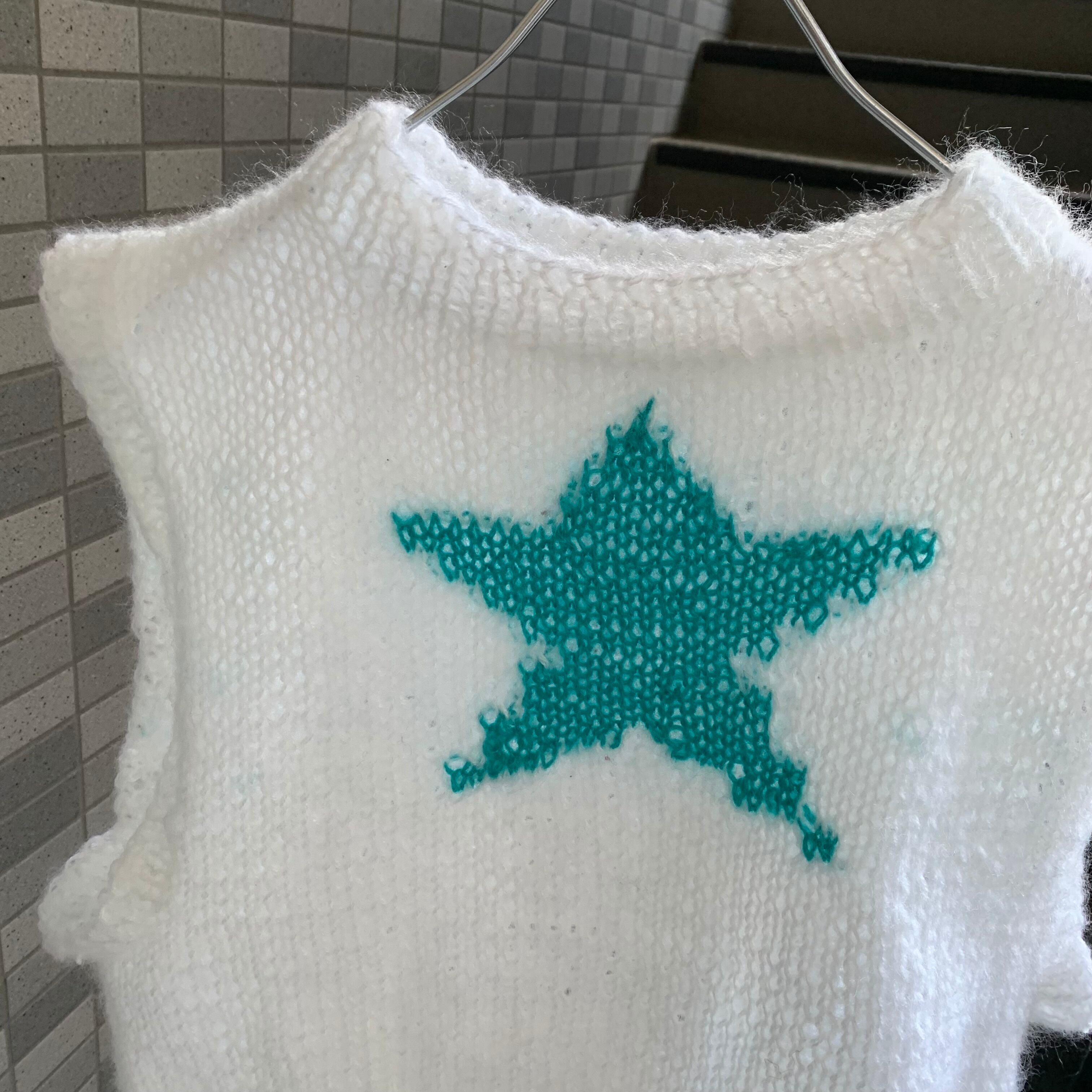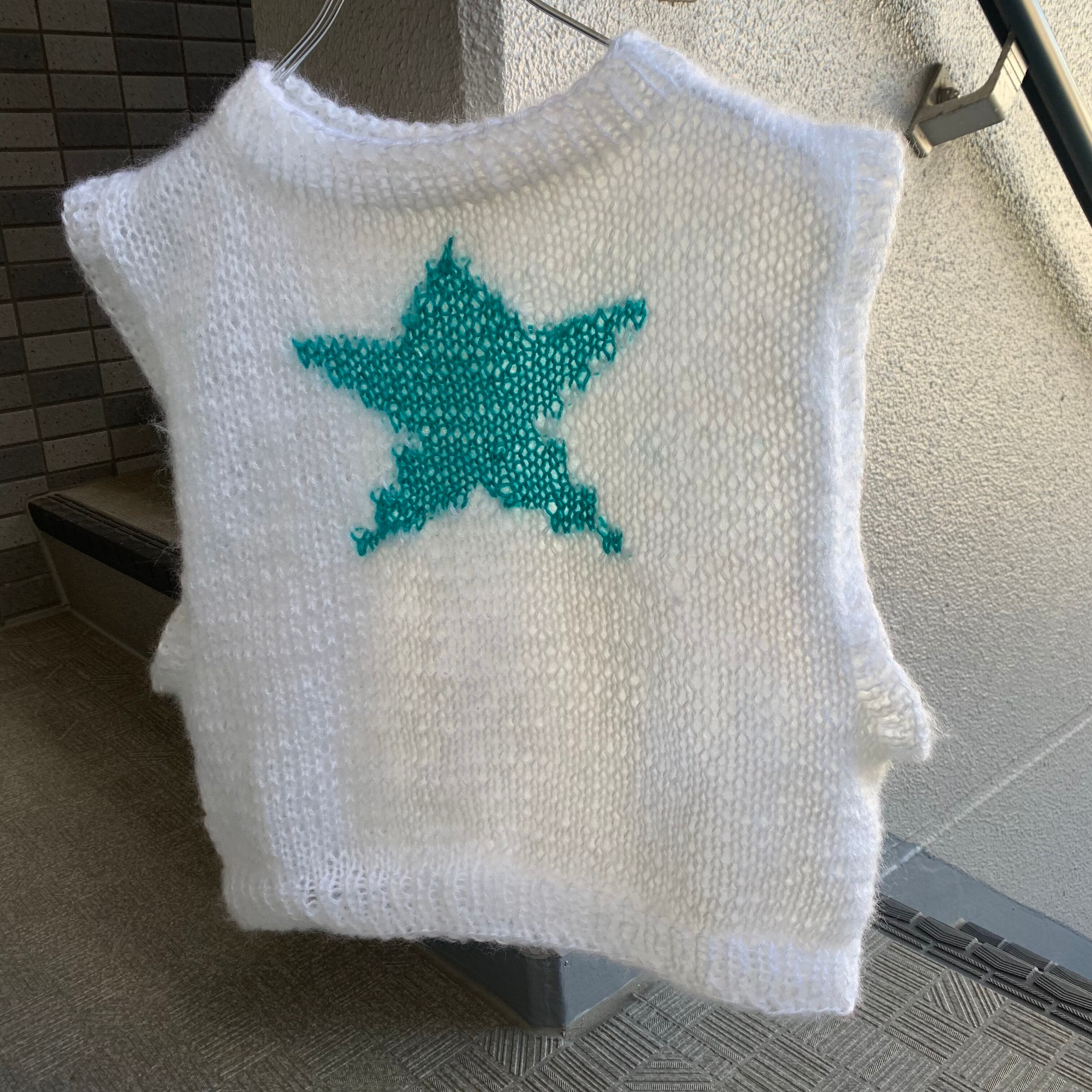ホワイトカラーにグリーンブルーカラーの 星を編み込みました。 素材はmohairとなっております。 アームホールも広く、スウェットの上からでも着用可能です。 サイズ(リブ部分込み) 肩幅 44センチ 身幅 53センチ 着丈 43センチ